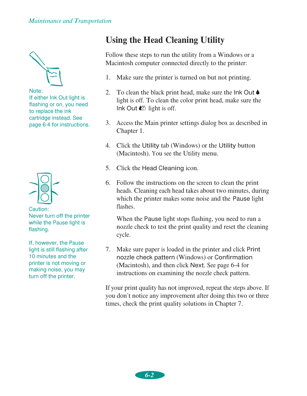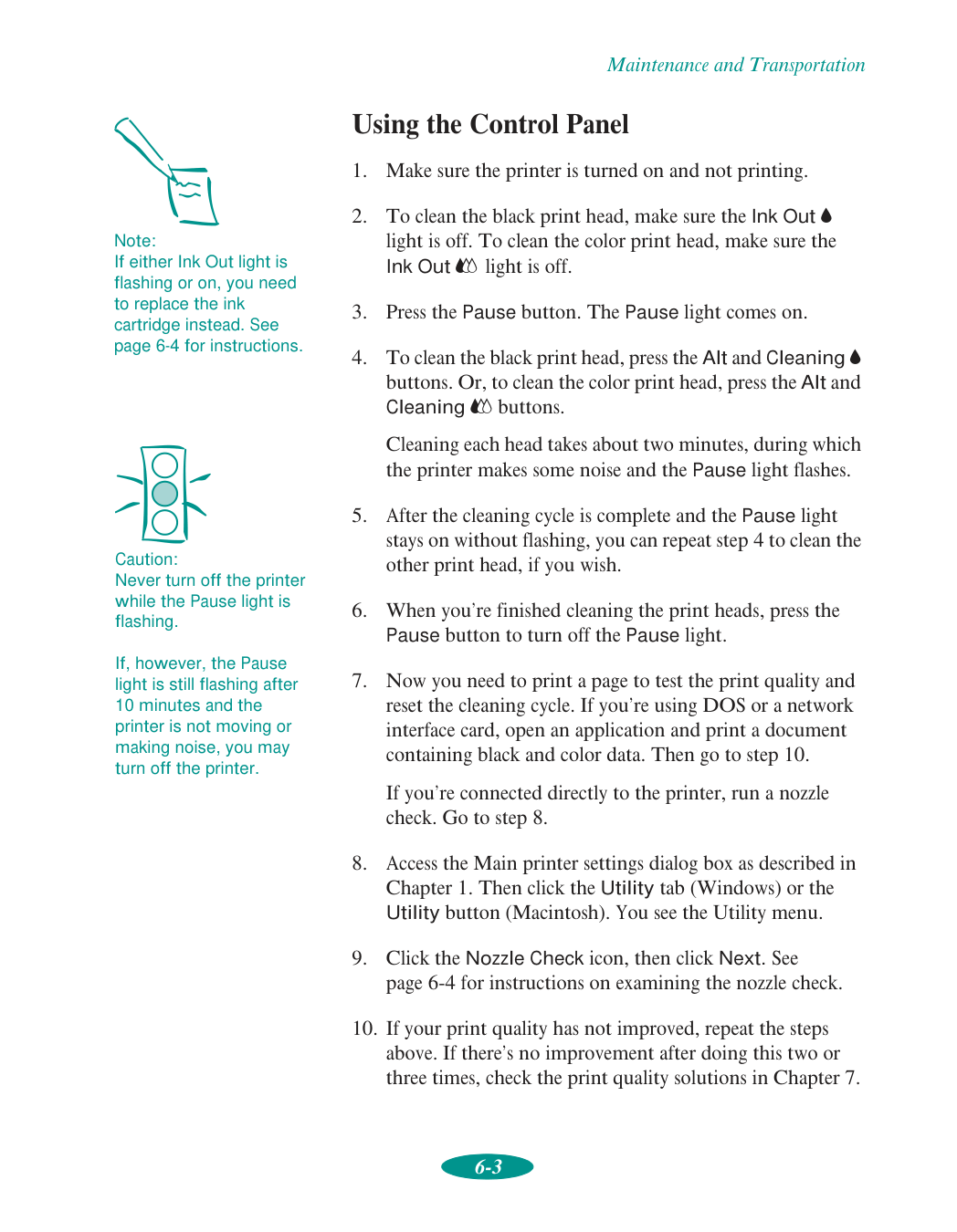 You can clean the print heads using either the Head Cleaning Utility on your computer or through the control panel on the printer itself. After cleaning, you should examine the nozzle check pattern to verify the cleaning was successful. See page 6-1 to 6-4 for detailed instructions.