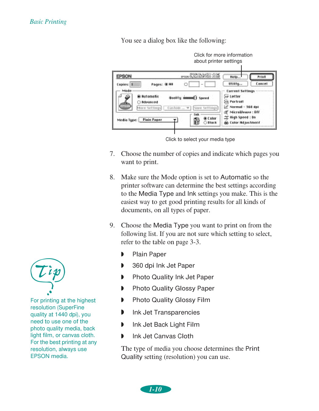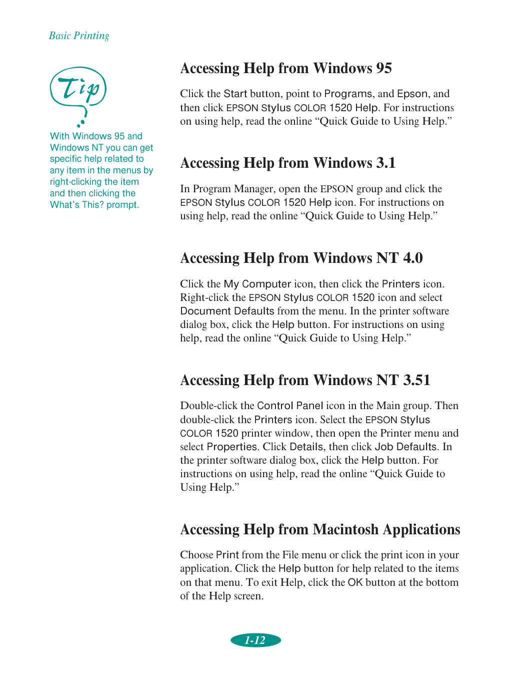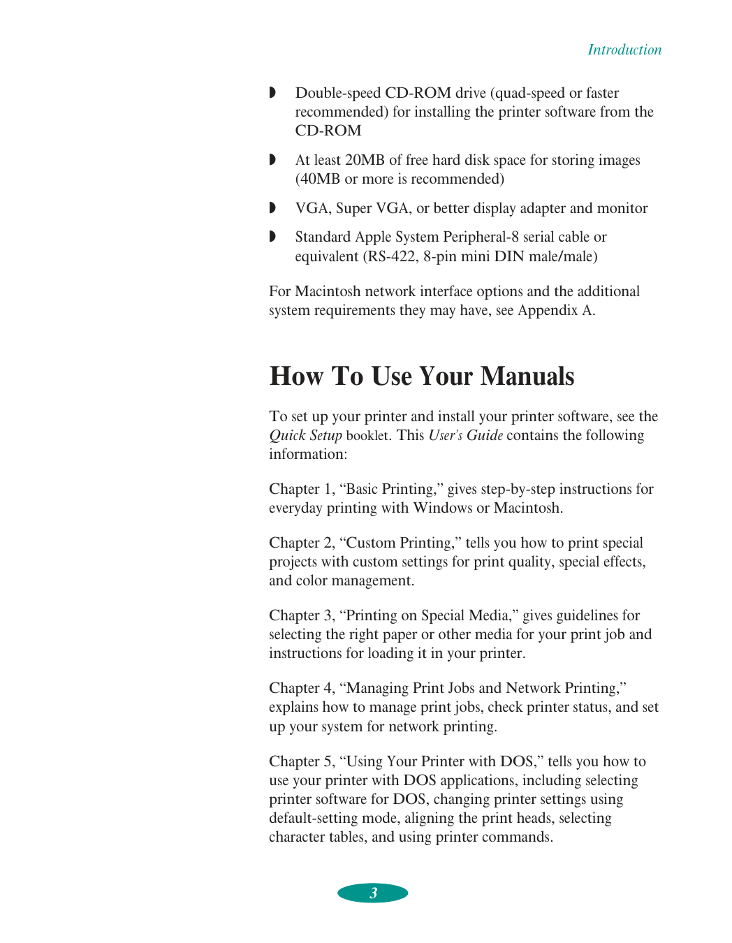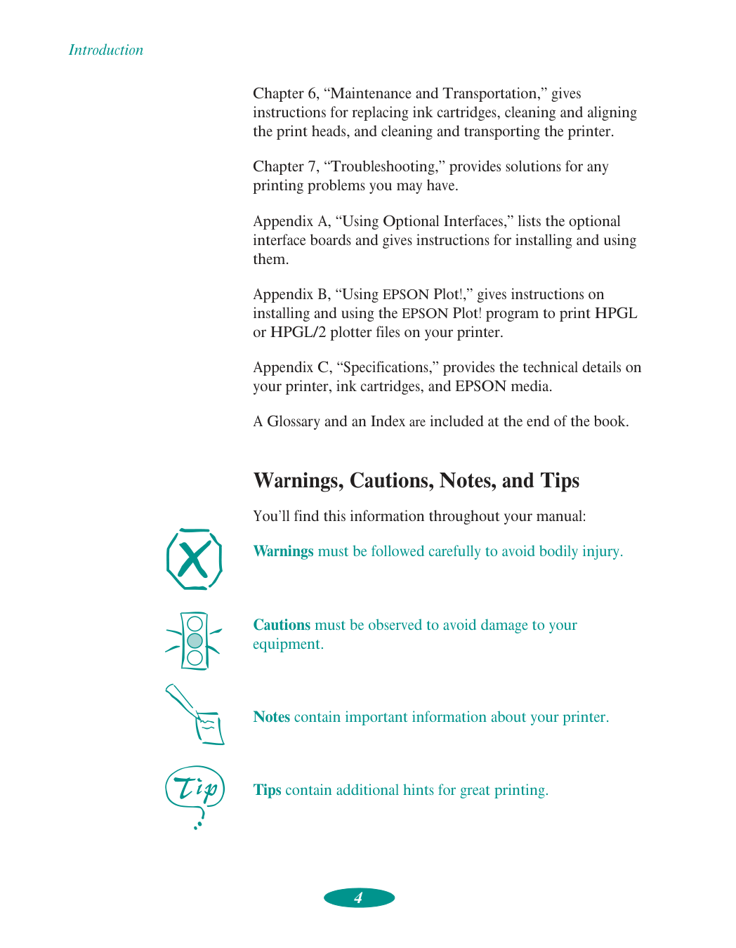 Standard Apple System Peripheral-8 serial cable or equivalent (RS-422, 8-pin mini DIN male/male) For Macintosh network interface options and the additional system requirements they may have, see Appendix A. How To Use Your Manuals To set up your printer and install your printer software, see the Quick Setup booklet. This User’s Guide contains the following information: Chapter 1, “Basic Printing,” gives step-by-step instructions for everyday printing with Windows or Macintosh. Chapter 2, “Custom Printing,” tells you how to print special projects with custom settings for print quality, special effects, and color management. Chapter 3, “Printing on Special Media,” gives guidelines for selecting the right paper or other media for your print job and instructions for loading it in your printer. Chapter 4, “Managing Print Jobs and Network Printing,” explains how to manage print jobs, check printer status, and set up your system for network printing. Chapter 5, “Using Your Printer with DOS,” tells you how to use your printer with DOS applications, including selecting printer software for DOS, changing printer settings using default-setting mode, aligning the print heads, selecting character tables, and using printer commands.Introduction 4 Chapter 6, “Maintenance and Transportation,” gives instructions for replacing ink cartridges, cleaning and aligning the print heads, and cleaning and transporting the printer. Chapter 7, “Troubleshooting,” provides solutions for any printing problems you may have. Appendix A, “Using Optional Interfaces,” lists the optional interface boards and gives instructions for installing and using them. Appendix B, “Using EPSON Plot!,” gives instructions on installing and using the EPSON Plot! program to print HPGL or HPGL/2 plotter files on your printer. Appendix C, “Specifications,” provides the technical details on your printer, ink cartridges, and EPSON media. A Glossary and an Index are included at the end of the book. Warnings, Cautions, Notes, and Tips You’ll find this information throughout your manual: Warnings must be followed carefully to avoid bodily injury. Cautions must be observed to avoid damage to your equipment. Notes contain important information about your printer. Tips contain additional hints for great printing.