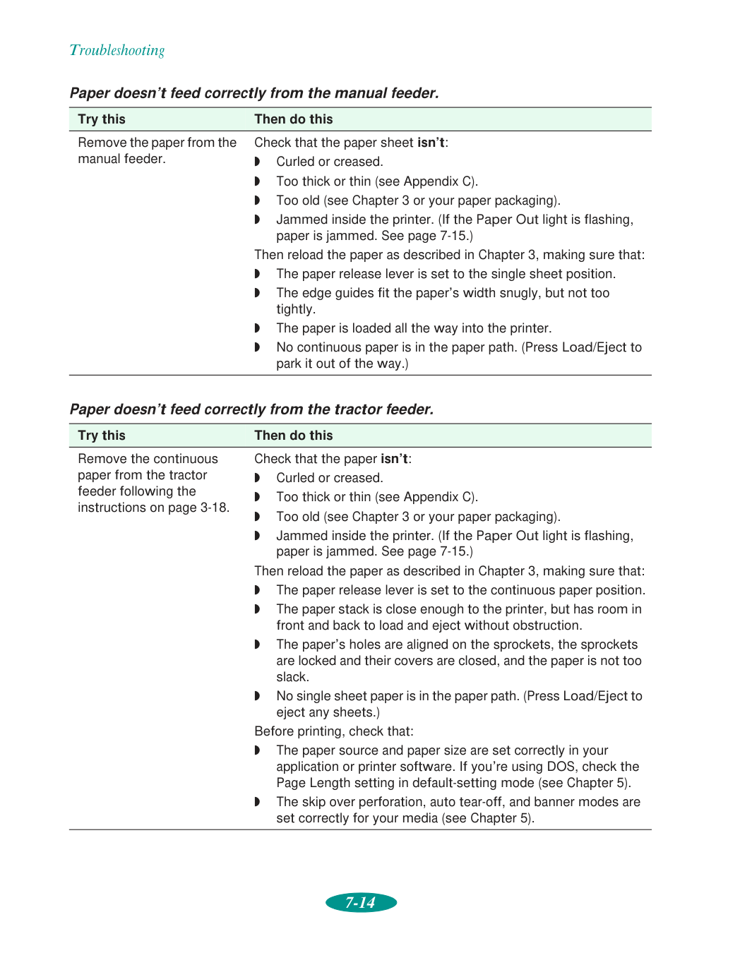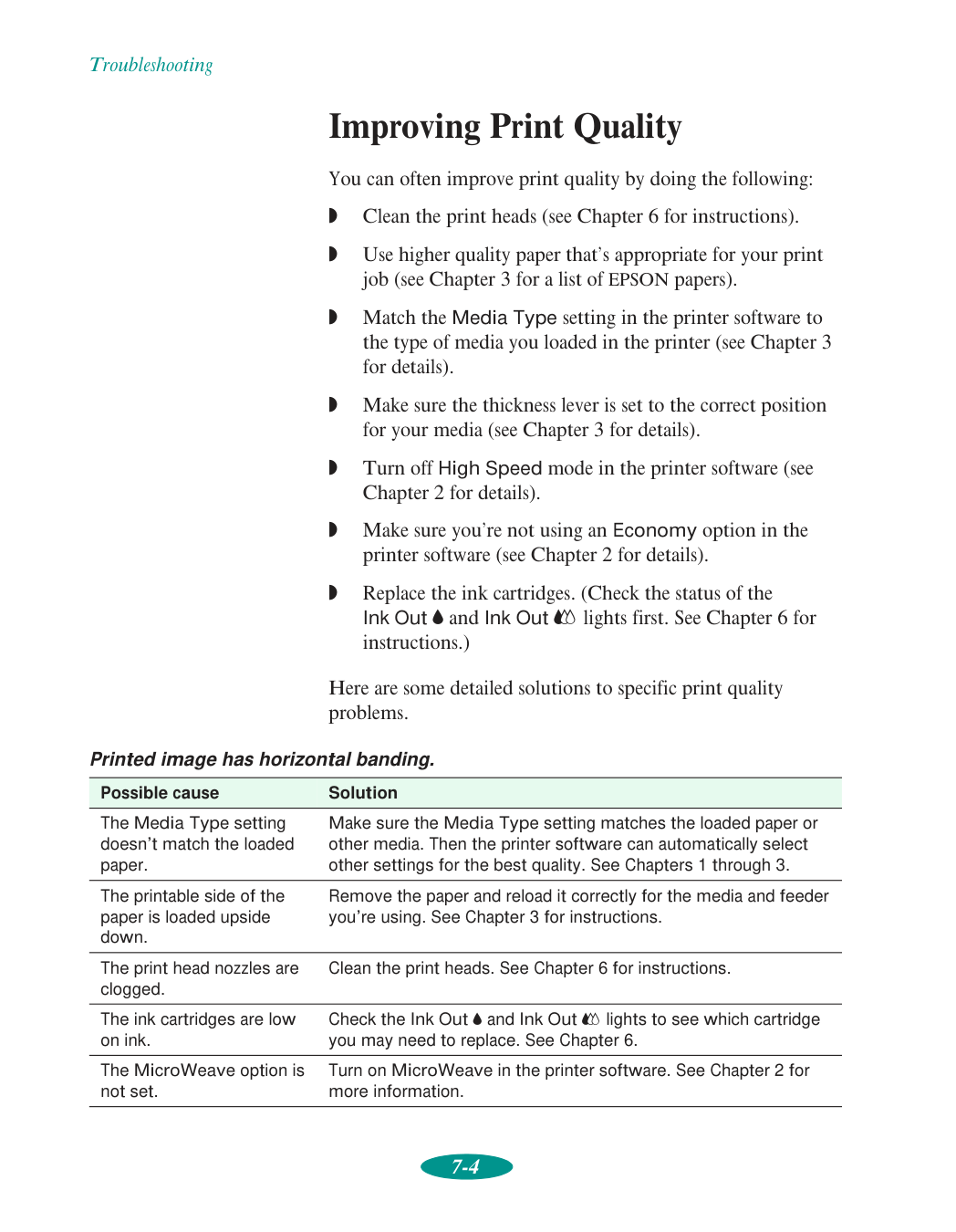 Banding, 7-4 to 7-5 Banner mode, 3-22, 5-3, 5-7 Banners choosing paper, 3-3 to 3-4 loading roll paper, 3-22 to 3-26 paper specifications, C-3 printing from Macintosh, 3-29 to 3-30 printing from Windows, 3-27 to 3-28 removing roll paper, 3-30 to 3-33 Basic printing, 1-1 to 1-14 Blank pages, 7-17 Blurry printouts, 7-6 to 7-7 Brightness setting, 2-9 Built-in sheet feeder, see Sheet feeder Buttons, control panel, 1-13 to 1-14C