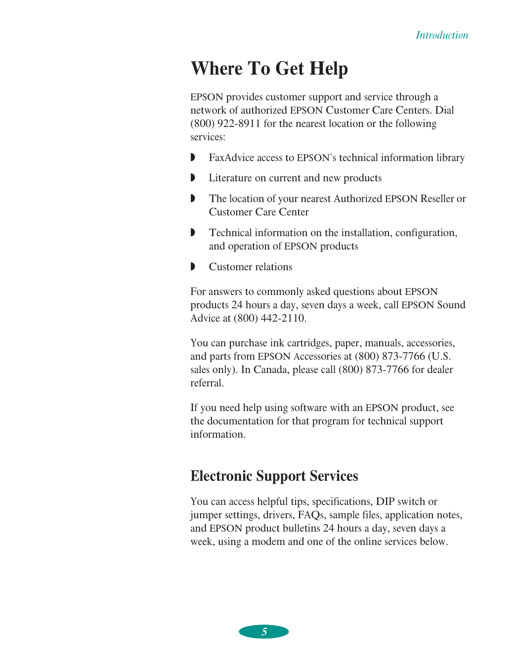 Customer relations For answers to commonly asked questions about EPSON products 24 hours a day, seven days a week, call EPSON Sound Advice at (800) 442-2110. You can purchase ink cartridges, paper, manuals, accessories, and parts from EPSON Accessories at (800) 873-7766 (U.S. sales only). In Canada, please call (800) 873-7766 for dealer referral. If you need help using software with an EPSON product, see the documentation for that program for technical support information. Electronic Support Services You can access helpful tips, specifications, DIP switch or jumper settings, drivers, FAQs, sample files, application notes, and EPSON product bulletins 24 hours a day, seven days a week, using a modem and one of the online services below.Introduction 6 World Wide Web From the Internet, you can reach EPSON’s Home Page at http://www.epson.com. EPSON Download Service You can call the EPSON Download Service at (800) 442-2007. Set your communications software to 8 data bits, 1 stop bit, no parity. Modem speed can be up to 28.8 Kbps. EPSON FaxAdvice Service You can access EPSON’s technical information library by calling (800) 442-2110 and selecting the appropriate phone option. You must provide a return fax number to use FaxAdvice. EPSON Forum on CompuServe Members of CompuServe® can type GO EPSON at the menu prompt to reach CompuServe’s Epson America Forum. As an owner of an EPSON product, you are eligible for a free introductory CompuServe membership, which entitles you to an introductory credit and your own user ID and password. To take advantage of this offer in the U.S. or Canada, call (800) 848-8199 and ask for representative #529.