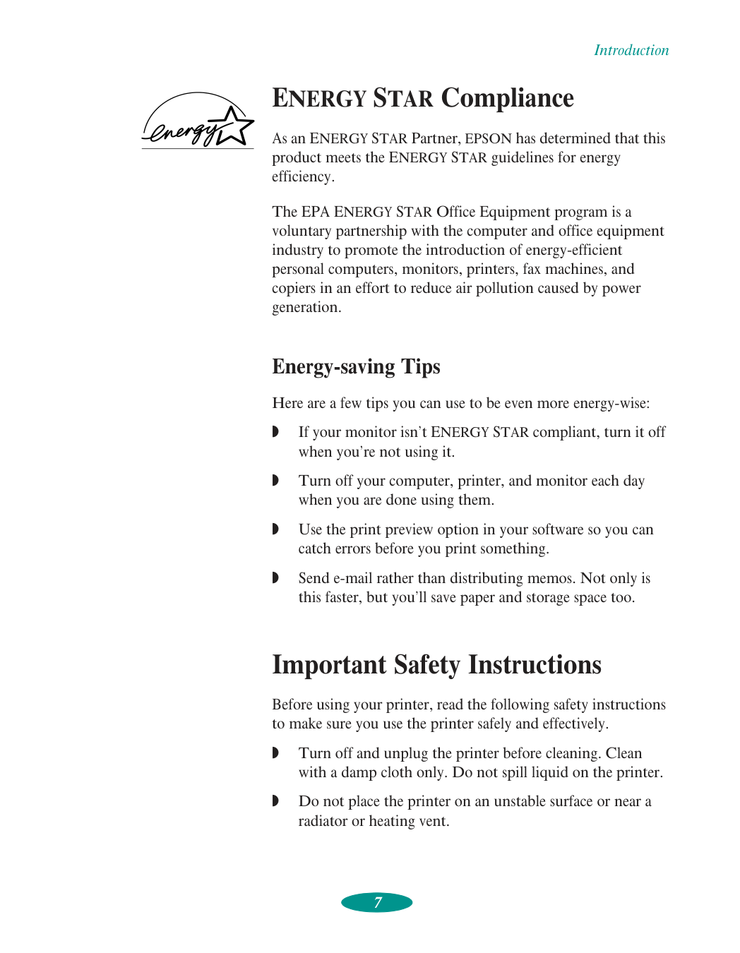 Introduction 7 ENERGY STAR Compliance As an ENERGY STAR Partner, EPSON has determined that this product meets the ENERGY STAR guidelines for energy efficiency. The EPA ENERGY STAR Office Equipment program is a voluntary partnership with the computer and office equipment industry to promote the introduction of energy-efficient personal computers, monitors, printers, fax machines, and copiers in an effort to reduce air pollution caused by power generation. Energy-saving Tips Here are a few tips you can use to be even more energy-wise: