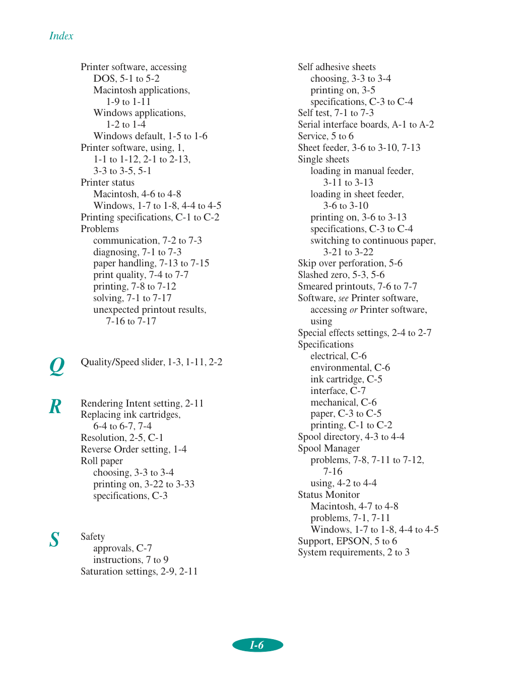 Safety approvals, C-7 instructions, 7 to 9 Saturation settings, 2-9, 2-11 Self adhesive sheets choosing, 3-3 to 3-4 printing on, 3-5 specifications, C-3 to C-4 Self test, 7-1 to 7-3 Serial interface boards, A-1 to A-2 Service, 5 to 6 Sheet feeder, 3-6 to 3-10, 7-13 Single sheets loading in manual feeder, 3-11 to 3-13 loading in sheet feeder, 3-6 to 3-10 printing on, 3-6 to 3-13 specifications, C-3 to C-4 switching to continuous paper, 3-21 to 3-22 Skip over perforation, 5-6 Slashed zero, 5-3, 5-6 Smeared printouts, 7-6 to 7-7 Software, see Printer software, accessing or Printer software, using Special effects settings, 2-4 to 2-7 Specifications electrical, C-6 environmental, C-6 ink cartridge, C-5 interface, C-7 mechanical, C-6 paper, C-3 to C-5 printing, C-1 to C-2 Spool directory, 4-3 to 4-4 Spool Manager problems, 7-8, 7-11 to 7-12, 7-16 using, 4-2 to 4-4 Status Monitor Macintosh, 4-7 to 4-8 problems, 7-1, 7-11 Windows, 1-7 to 1-8, 4-4 to 4-5 Support, EPSON, 5 to 6 System requirements, 2 to 3Index