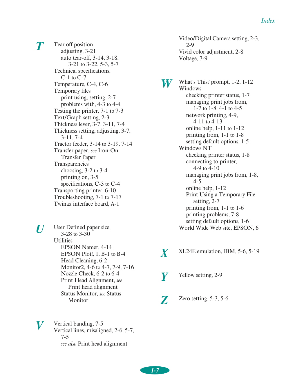 I/F mode, 5-5, A-4 IBM XL24E emulation, 5-6, 5-19 ICM (Image Color Matching), 2-3, 2-7 to 2-10 Improving print quality, 7-4 to 7-7 Incorrect characters, 7-16 margins, 7-17 Index cards, see Ink jet cards Ink monitoring level, 1-7 to 1-8, 4-5, 4-8 setting, 1-3, 1-11, 2-2, 2-5, 6-7 Ink cartridge printing with empty color, 6-7 problems, 7-4, 7-7, 7-9 to 7-10 replacing, 6-4 to 6-7, 7-4 specifications, C-5 Ink Jet Back Light Film choosing, 3-3 to 3-4 printing on, 3-33 to 3-35 specifications, C-3 Ink Jet Canvas Cloth choosing, 3-3 to 3-4 printing on, 3-22 to 3-30 removing, 3-30 to 3-33 specifications, C-3 Ink jet cards choosing, 3-2 to 3-4 printing on, 3-10 specifications, C-3 to C-4 Ink jet paper choosing, 3-2 to 3-4 printing on, 3-5 specifications, C-3 to C-4Index