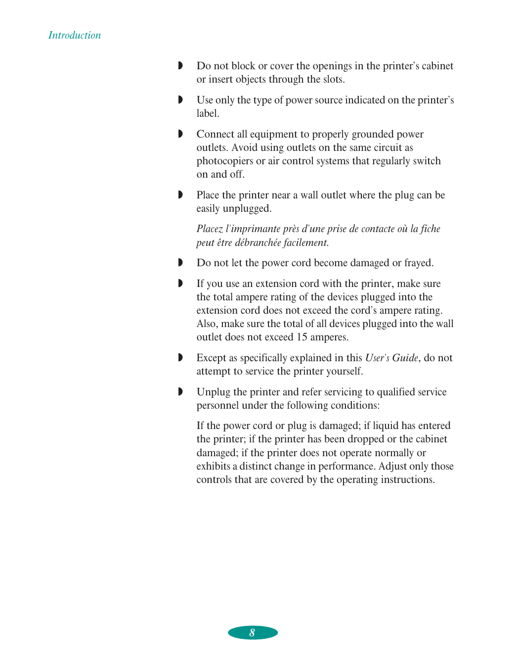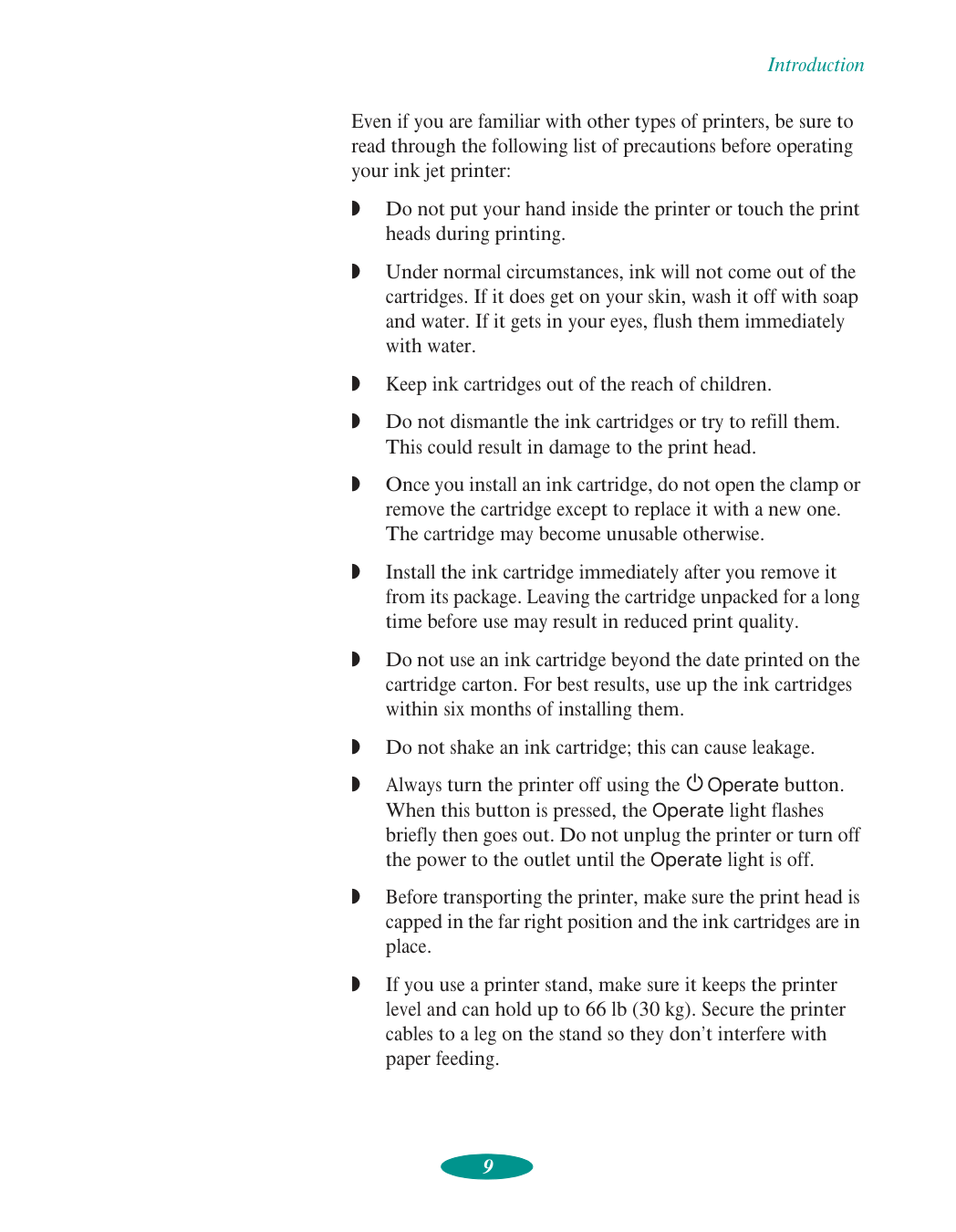 Unplug the printer and refer servicing to qualified service personnel under the following conditions: If the power cord or plug is damaged; if liquid has entered the printer; if the printer has been dropped or the cabinet damaged; if the printer does not operate normally or exhibits a distinct change in performance. Adjust only those controls that are covered by the operating instructions.Introduction 9 Even if you are familiar with other types of printers, be sure to read through the following list of precautions before operating your ink jet printer:
