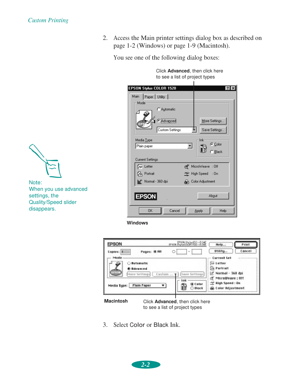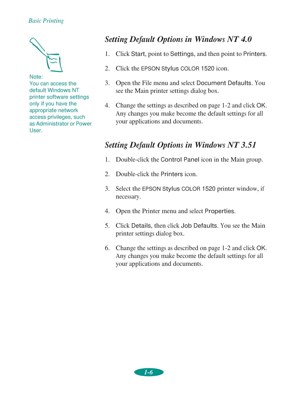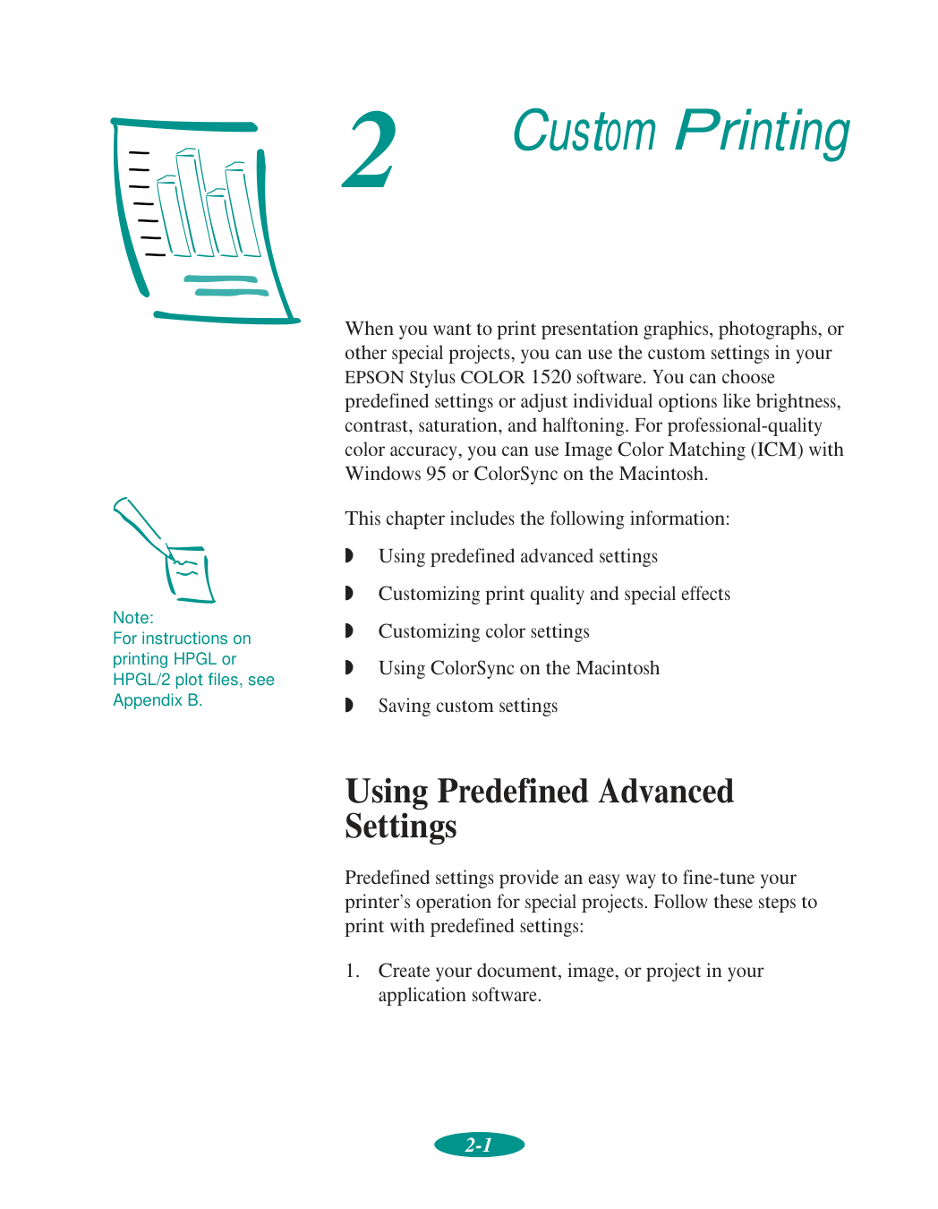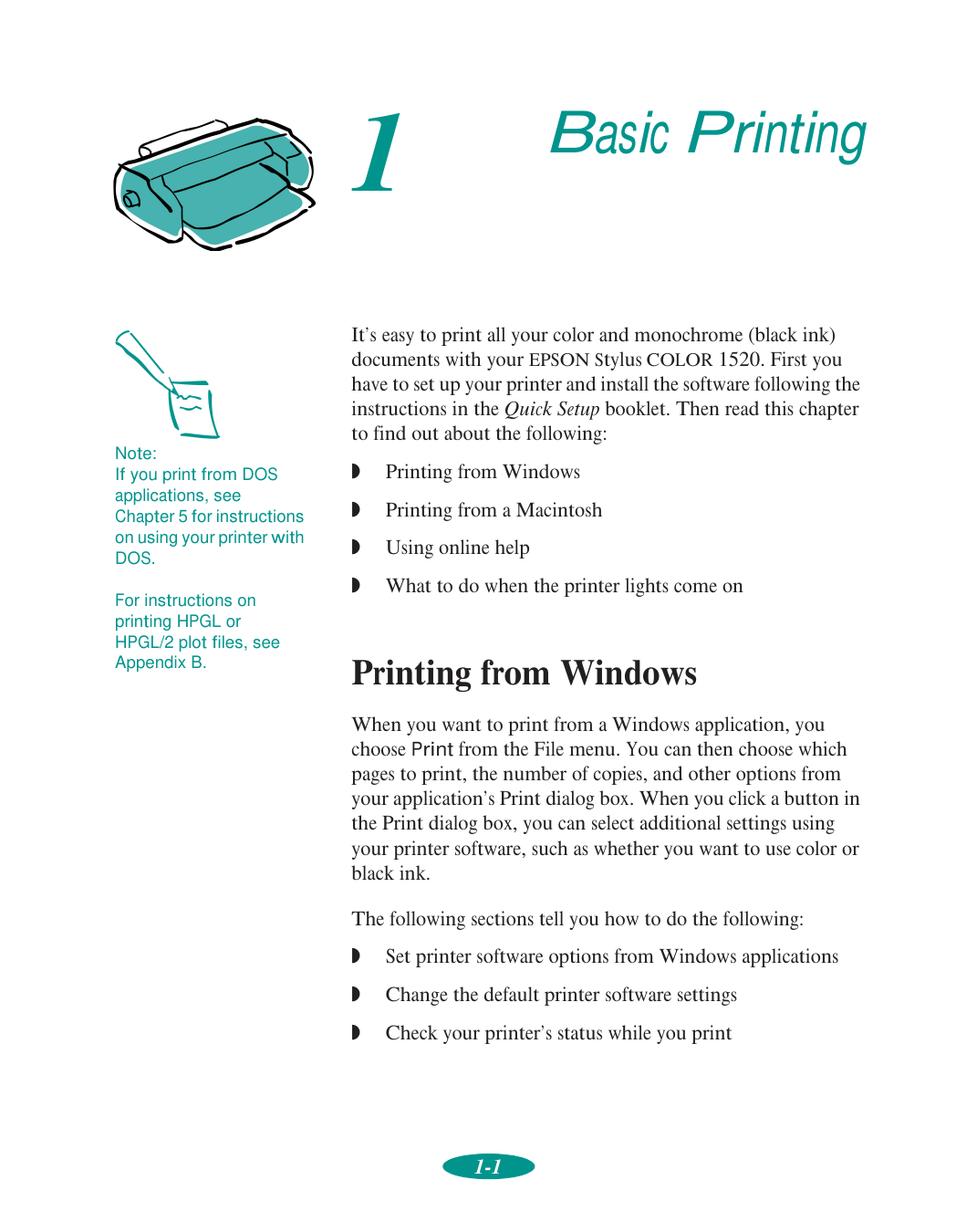 If you use a printer stand, make sure it keeps the printer level and can hold up to 66 lb (30 kg). Secure the printer cables to a leg on the stand so they don’t interfere with paper feeding.1-1 1 It’s easy to print all your color and monochrome (black ink) documents with your EPSON Stylus COLOR 1520. First you have to set up your printer and install the software following the instructions in the Quick Setup booklet. Then read this chapter to find out about the following:
