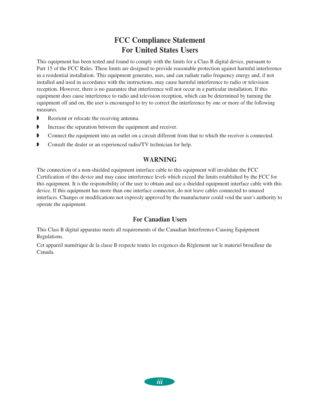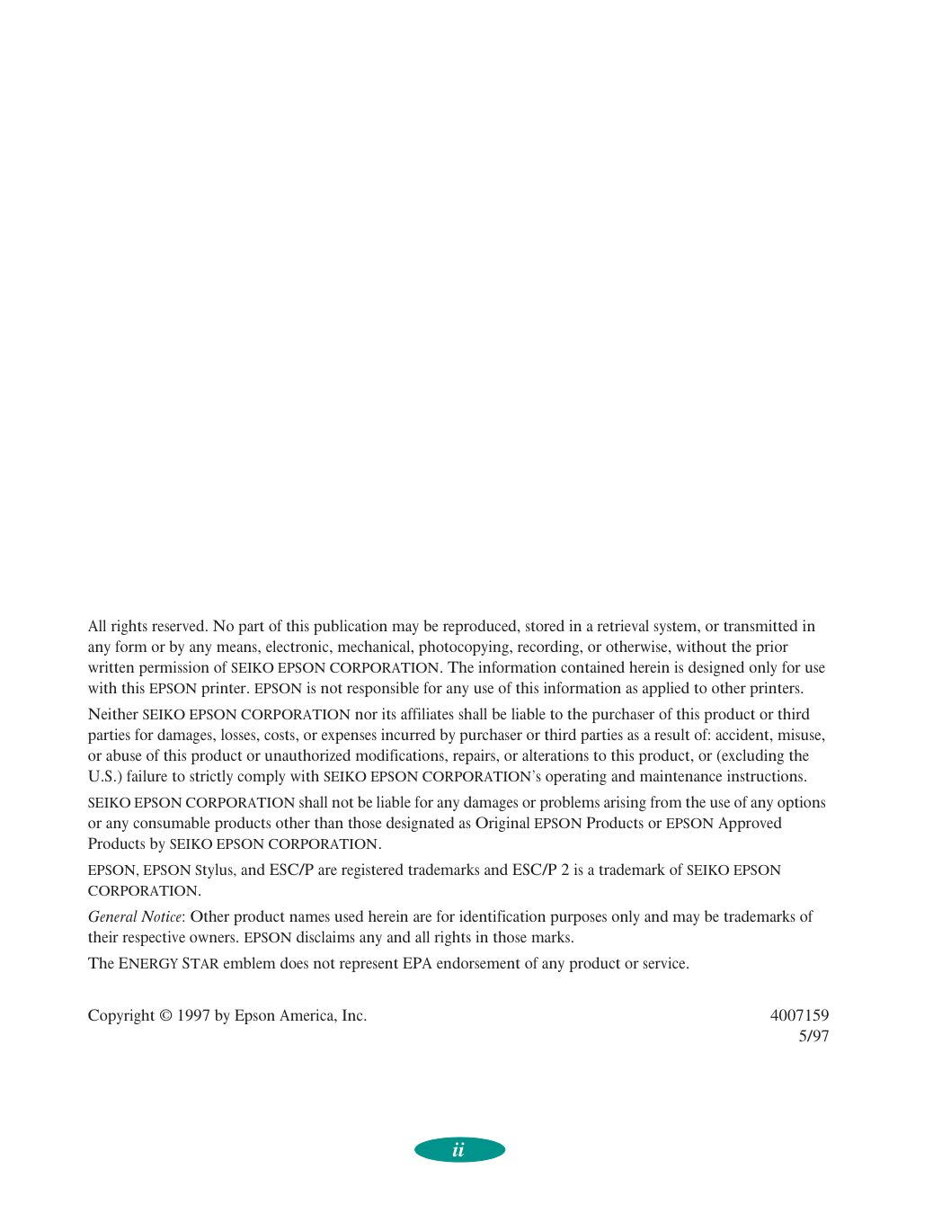 General Notice: Other product names used herein are for identification purposes only and may be trademarks of their respective owners. EPSON disclaims any and all rights in those marks. The ENERGY STAR emblem does not represent EPA endorsement of any product or service. Copyright © 1997 by Epson America, Inc. 4007159 5/97iii FCC Compliance Statement For United States Users This equipment has been tested and found to comply with the limits for a Class B digital device, pursuant to Part 15 of the FCC Rules. These limits are designed to provide reasonable protection against harmful interference in a residential installation. This equipment generates, uses, and can radiate radio frequency energy and, if not installed and used in accordance with the instructions, may cause harmful interference to radio or television reception. However, there is no guarantee that interference will not occur in a particular installation. If this equipment does cause interference to radio and television reception, which can be determined by turning the equipment off and on, the user is encouraged to try to correct the interference by one or more of the following measures.