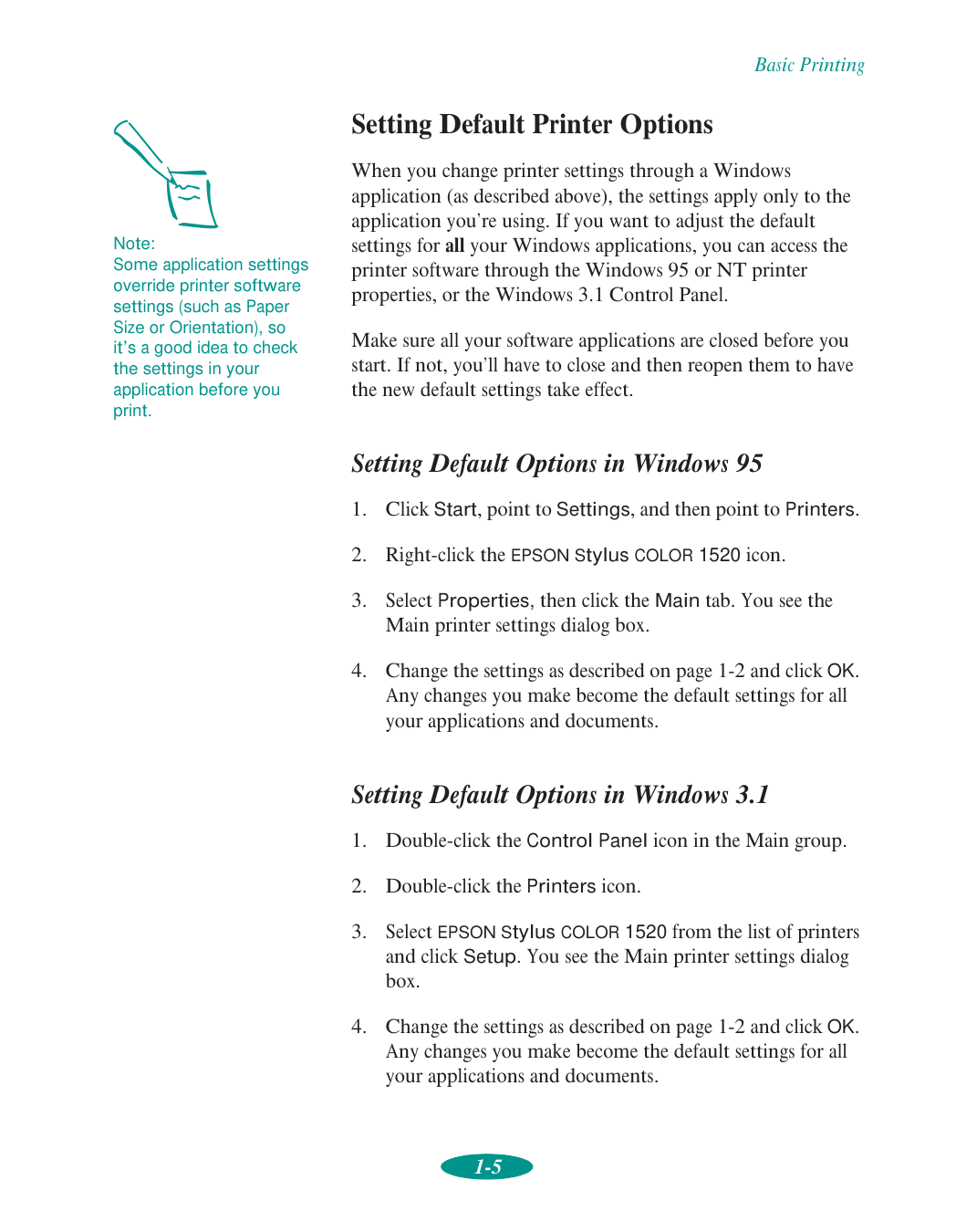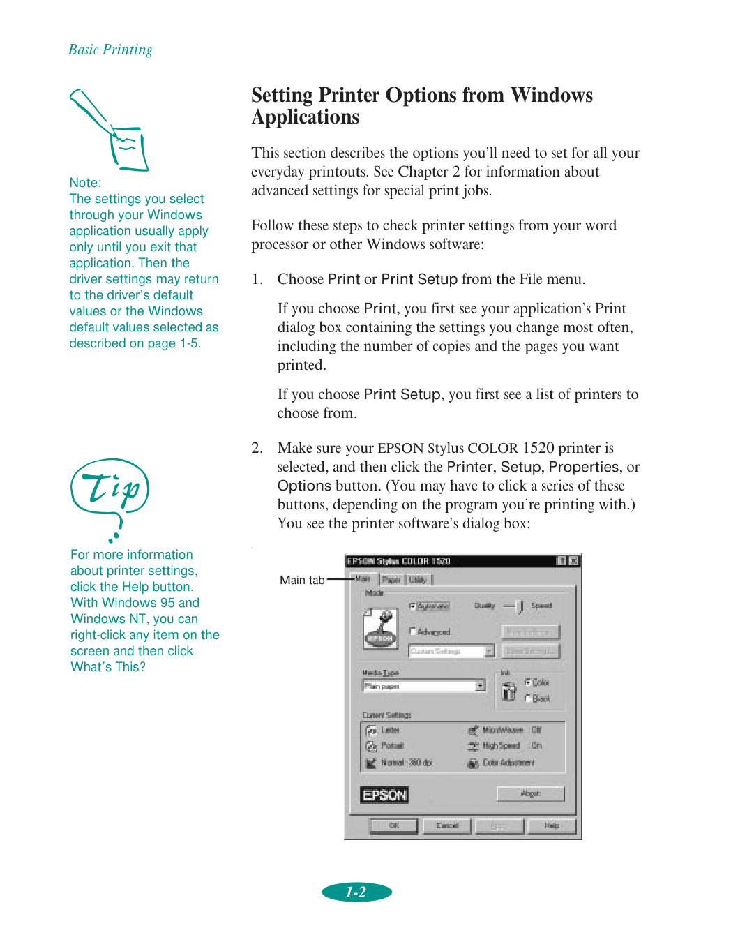 For instructions on printing HPGL or HPGL/2 plot files, see Appendix B.Basic Printing 1-2 Setting Printer Options from Windows Applications This section describes the options you’ll need to set for all your everyday printouts. See Chapter 2 for information about advanced settings for special print jobs. Follow these steps to check printer settings from your word processor or other Windows software: