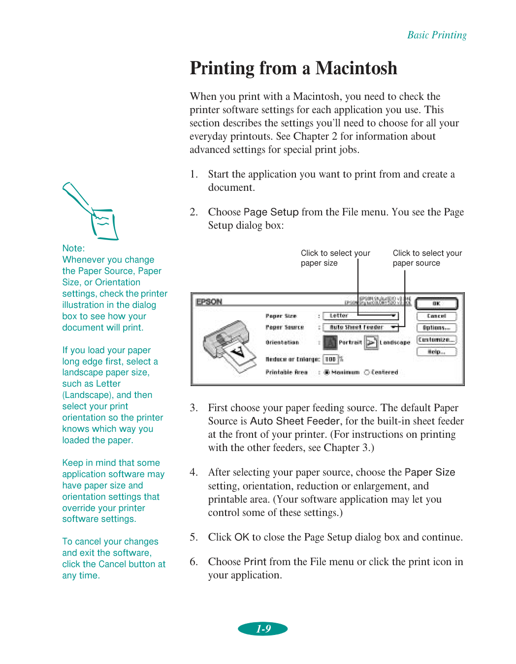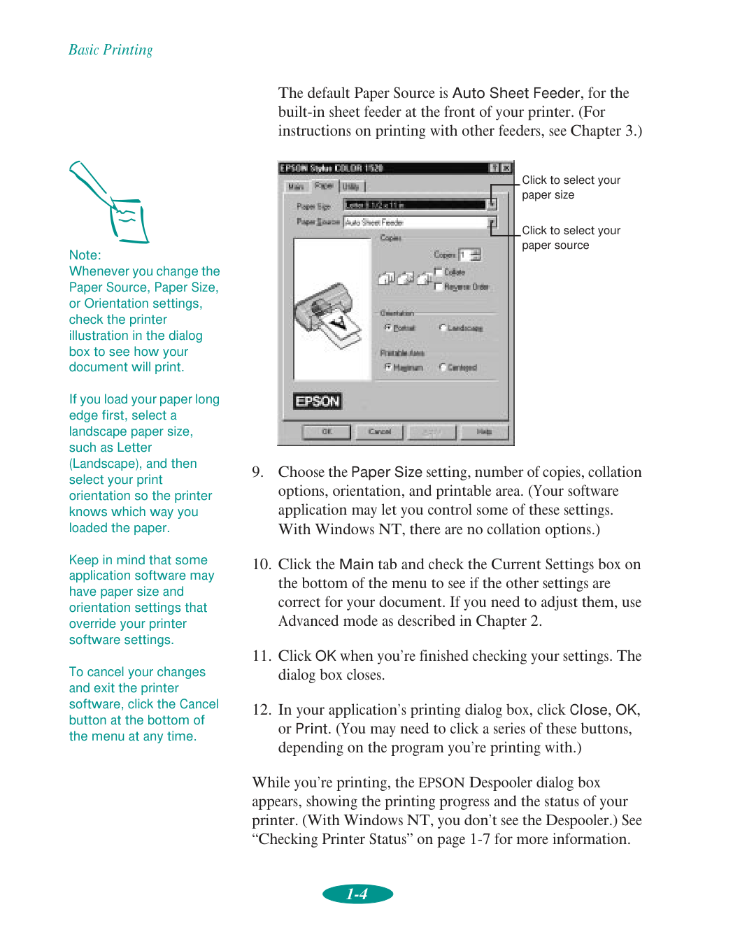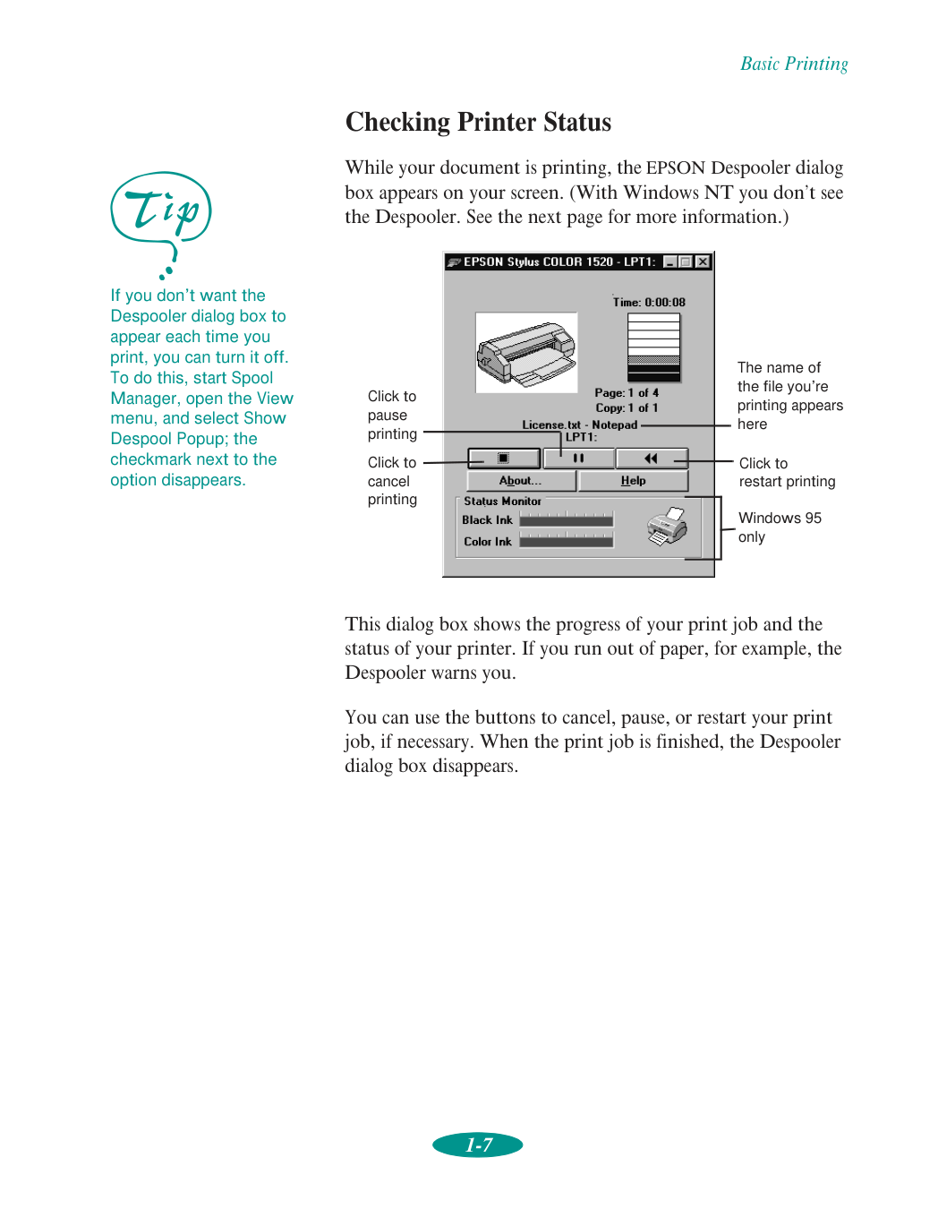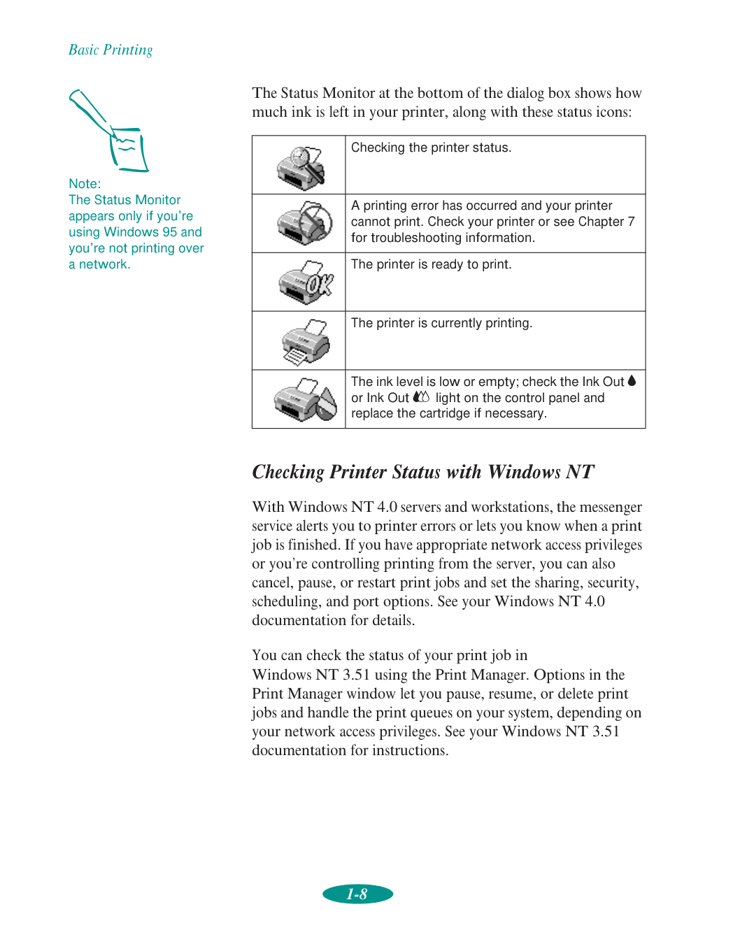 Check your printer’s status while you print Basic Printing Note: If you print from DOS applications, see Chapter 5 for instructions on using your printer withDos.