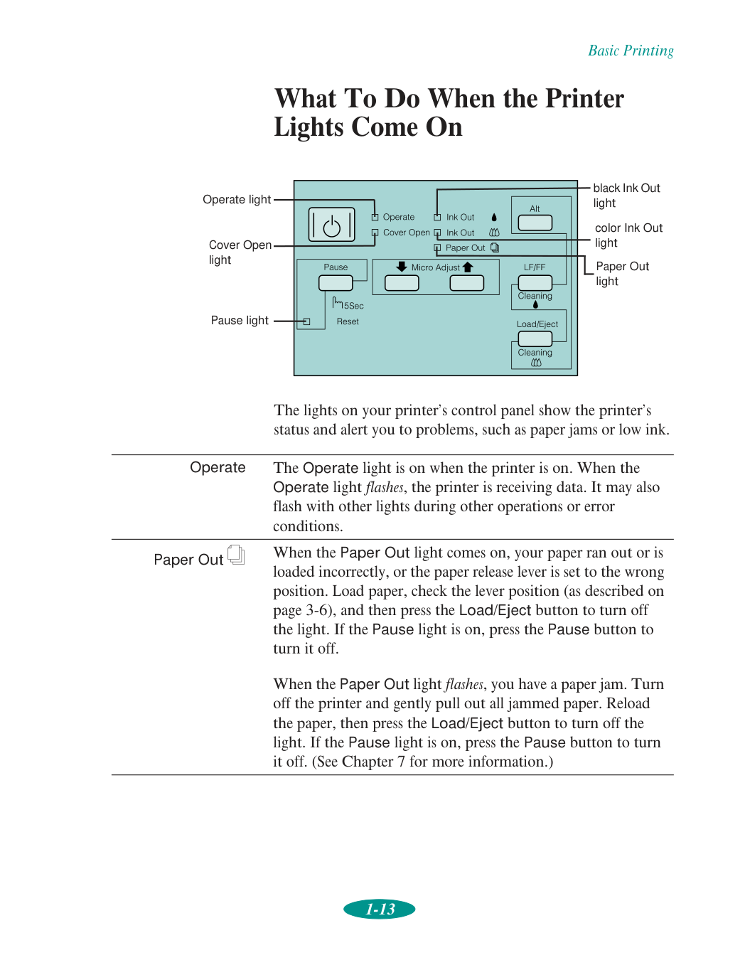 Refer to the section 'What To Do When the Printer Lights Come On' on page 1-13 for guidance on specific error indicators. The manual also includes a troubleshooting section starting on page 7-1 with information on diagnosing problems and running a self test.