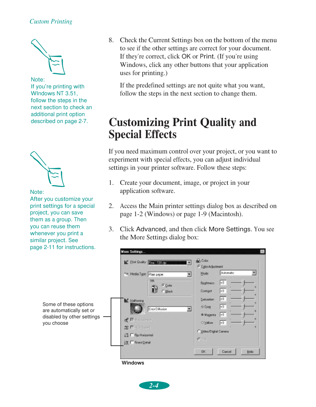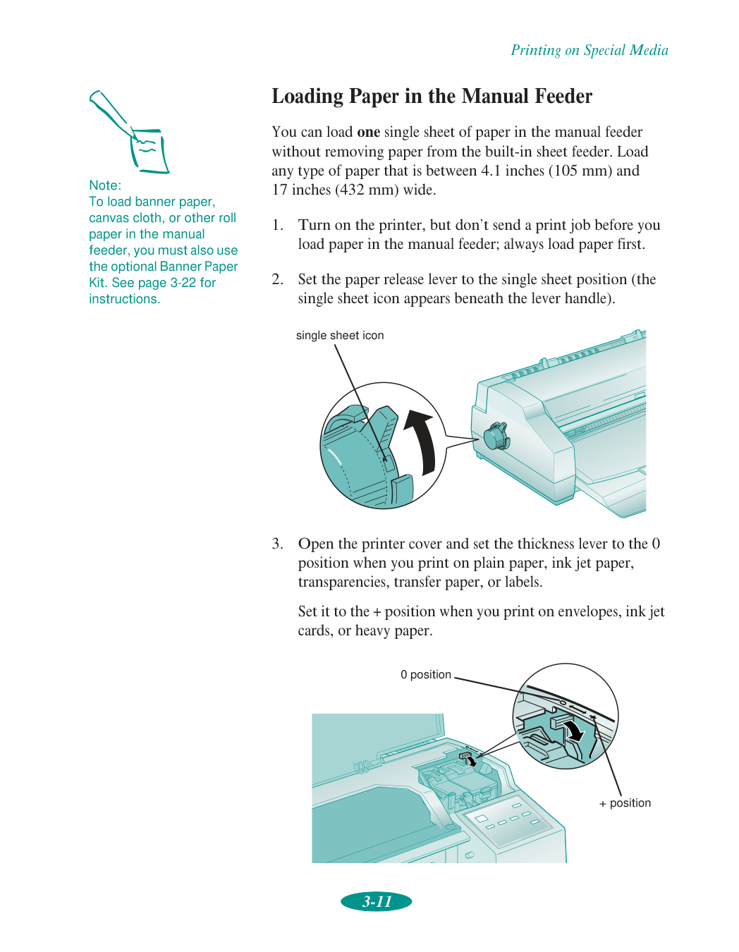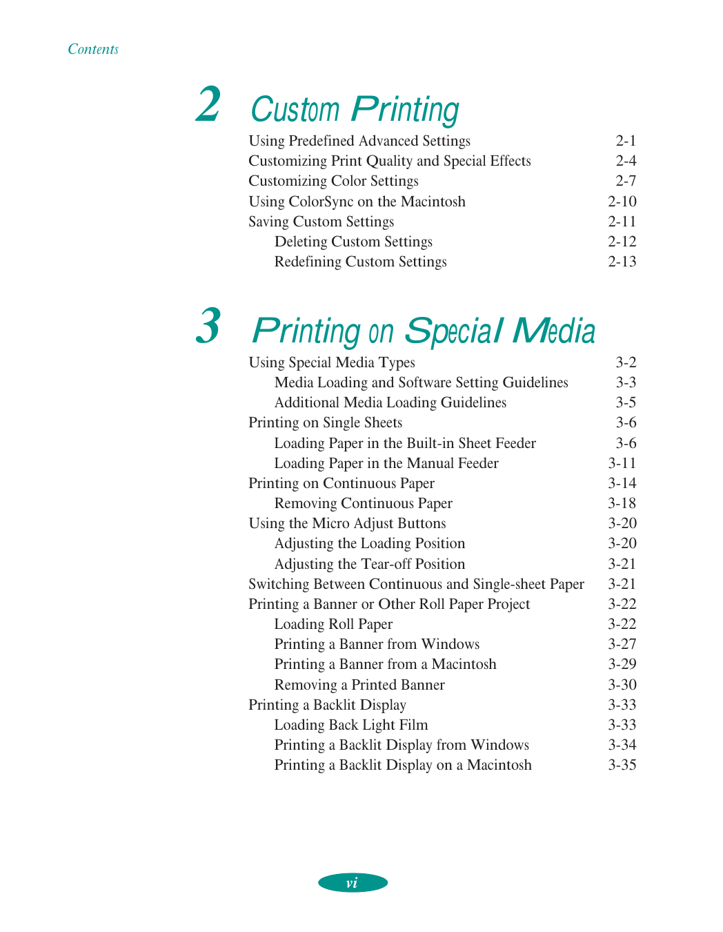 Contents vi 2 Custom Printing Using Predefined Advanced Settings 2-1 Customizing Print Quality and Special Effects 2-4 Customizing Color Settings 2-7 Using ColorSync on the Macintosh 2-10 Saving Custom Settings 2-11 Deleting Custom Settings 2-12 Redefining Custom Settings 2-13 3 Printing on Special Media Using Special Media Types 3-2 Media Loading and Software Setting Guidelines 3-3 Additional Media Loading Guidelines 3-5 Printing on Single Sheets 3-6 Loading Paper in the Built-in Sheet Feeder 3-6 Loading Paper in the Manual Feeder 3-11 Printing on Continuous Paper 3-14 Removing Continuous Paper 3-18 Using the Micro Adjust Buttons 3-20 Adjusting the Loading Position 3-20 Adjusting the Tear-off Position 3-21 Switching Between Continuous and Single-sheet Paper 3-21 Printing a Banner or Other Roll Paper Project 3-22 Loading Roll Paper 3-22 Printing a Banner from Windows 3-27 Printing a Banner from a Macintosh 3-29 Removing a Printed Banner 3-30 Printing a Backlit Display 3-33 Loading Back Light Film 3-33 Printing a Backlit Display from Windows 3-34 Printing a Backlit Display on a Macintosh 3-35