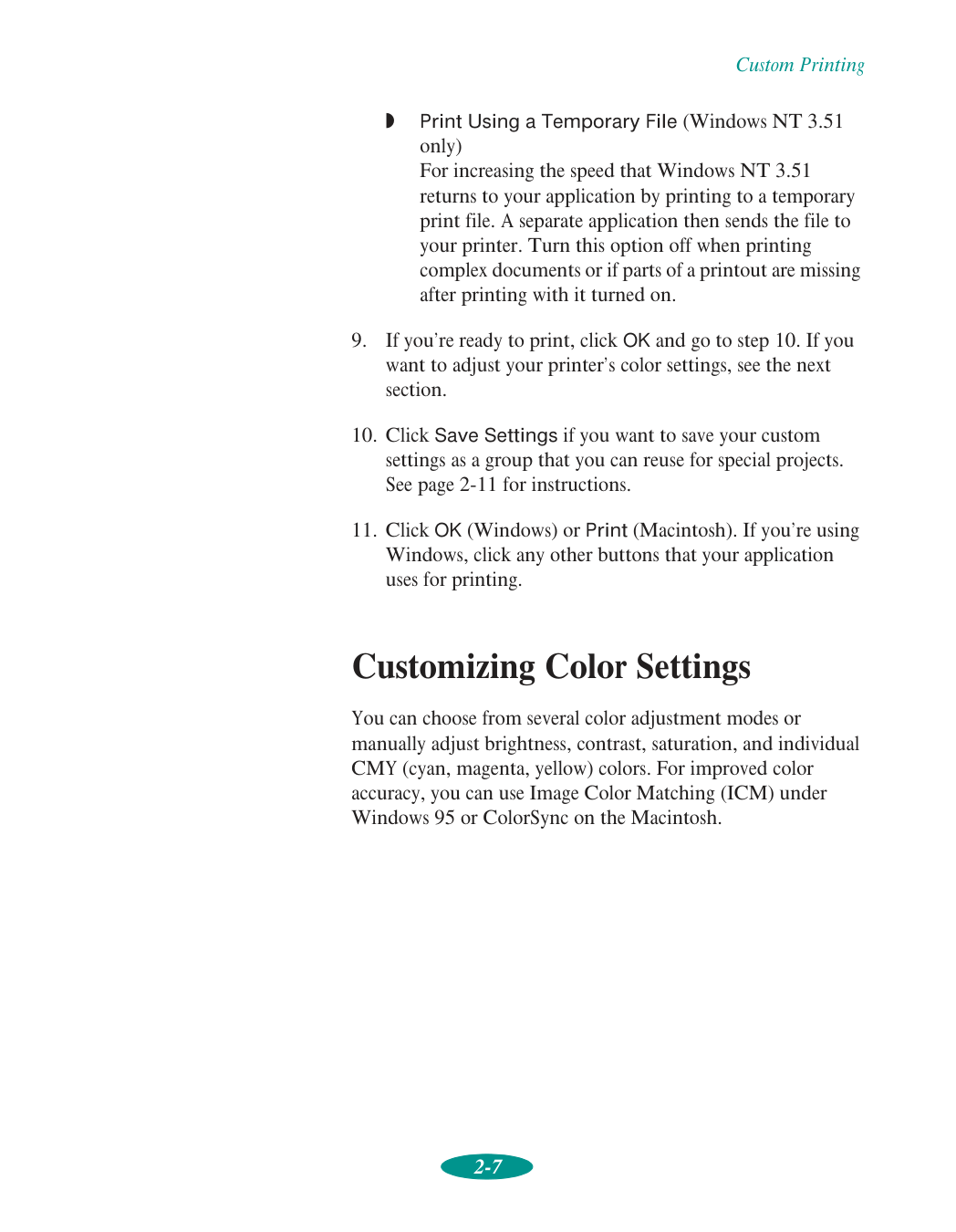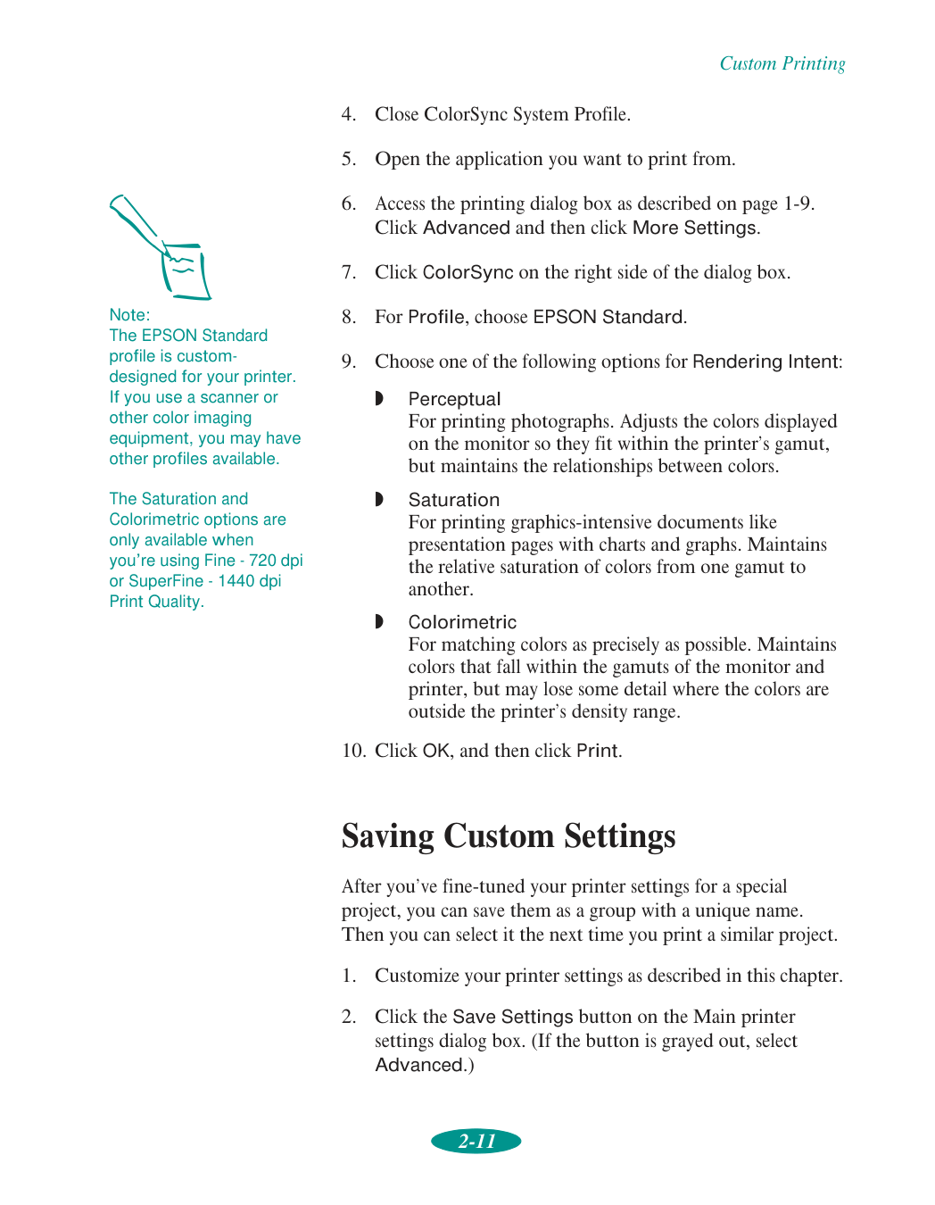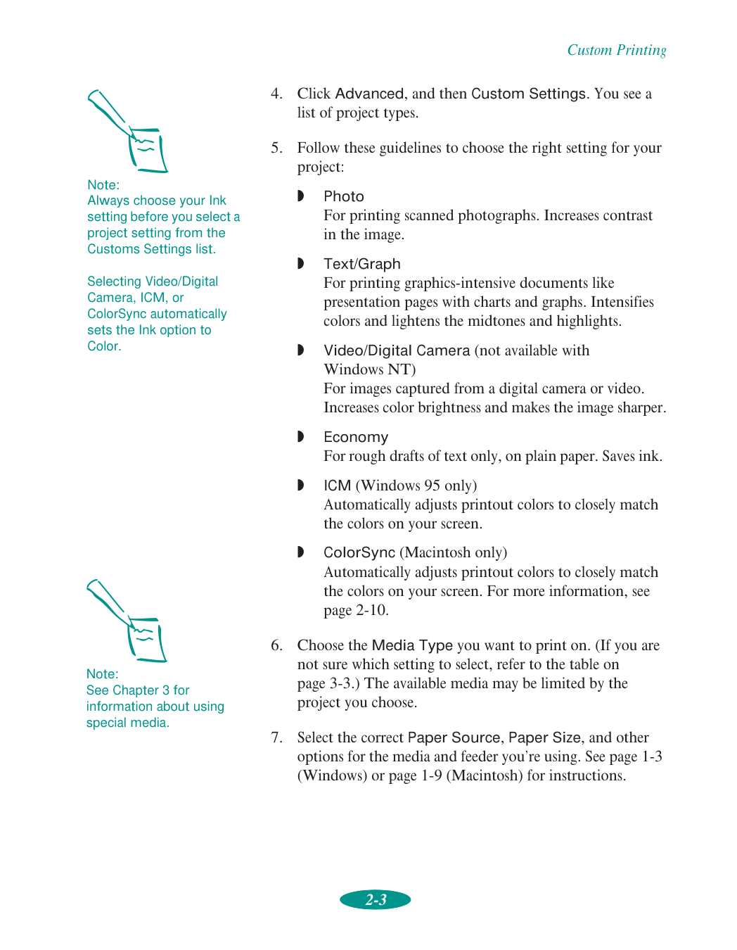 Contents vi 2 Custom Printing Using Predefined Advanced Settings 2-1 Customizing Print Quality and Special Effects 2-4 Customizing Color Settings 2-7 Using ColorSync on the Macintosh 2-10 Saving Custom Settings 2-11 Deleting Custom Settings 2-12 Redefining Custom Settings 2-13 3 Printing on Special Media Using Special Media Types 3-2 Media Loading and Software Setting Guidelines 3-3 Additional Media Loading Guidelines 3-5 Printing on Single Sheets 3-6 Loading Paper in the Built-in Sheet Feeder 3-6 Loading Paper in the Manual Feeder 3-11 Printing on Continuous Paper 3-14 Removing Continuous Paper 3-18 Using the Micro Adjust Buttons 3-20 Adjusting the Loading Position 3-20 Adjusting the Tear-off Position 3-21 Switching Between Continuous and Single-sheet Paper 3-21 Printing a Banner or Other Roll Paper Project 3-22 Loading Roll Paper 3-22 Printing a Banner from Windows 3-27 Printing a Banner from a Macintosh 3-29 Removing a Printed Banner 3-30 Printing a Backlit Display 3-33 Loading Back Light Film 3-33 Printing a Backlit Display from Windows 3-34 Printing a Backlit Display on a Macintosh 3-35