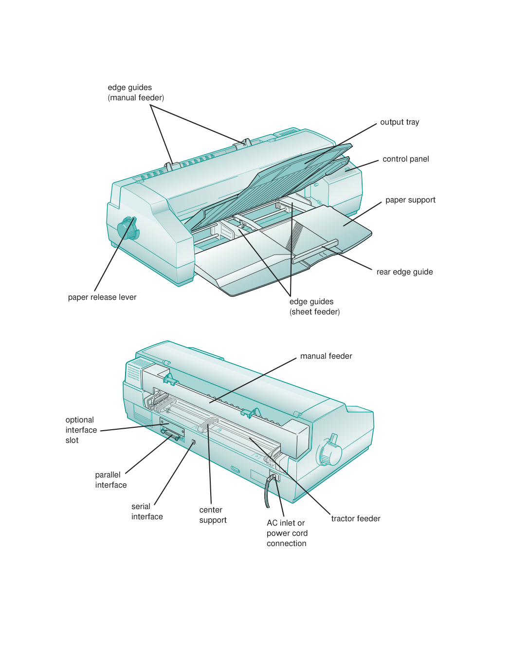 The connection of a non-shielded equipment interface cable to this equipment will invalidate the FCC Certification of this device and may cause interference levels which exceed the limits established by the FCC for this equipment. It is the responsibility of the user to obtain and use a shielded equipment interface cable with this device. If this equipment has more than one interface connector, do not leave cables connected to unused interfaces. Changes or modifications not expressly approved by the manufacturer could void the user’s authority to operate the equipment. For Canadian Users This Class B digital apparatus meets all requirements of the Canadian Interference-Causing Equipment Regulations. Cet appareil numérique de la classe B respecte toutes les exigences du Règlement sur le materiel brouilleur du Canada.-xvi edge guides (manual feeder) paper support control panel output tray edge guides (sheet feeder) rear edge guide paper release lever manual feeder tractor feeder AC inlet or power cord connection center support serial interface parallel interface optional interface slot