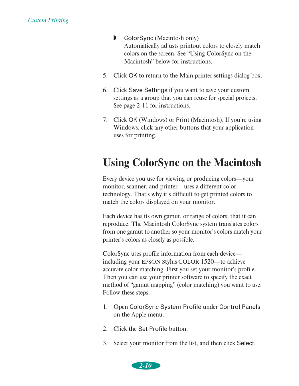 Colorimetric setting, 2-11 ColorSync, 2-3, 2-7, 2-10 to 2-11 Commands, printer, 5-17 to 5-19 Communication problems, 7-2 to 7-3 CompuServe, 6 Continuous paper choosing settings for, 3-3 to 3-5 printing on, 3-14 to 3-17 removing, 3-18 to 3-19 specifications, C-3 to C-5 switching to single sheets, 3-21 to 3-22 Contrast setting, 2-9 Control codes, 5-17 to 5-19, C-1 Control panel buttons, 1-13 to 1-14 default-setting mode, 5-3 to 5-7, 7-16, C-2 lights, 1-13 to 1-14, 7-1, 7-8 to 7-10 print head alignment, 6-9 print head cleaning, 6-3 using, 1-13 to 1-14, 7-1 Control Panels, Macintosh, 2-10 Current Settings box, 1-4, 1-11, 2-4 Custom paper size, 3-28 to 3-30 Custom settings color, 2-7 to 2-10 deleting, 2-12 print quality, 2-4 to 2-7 printing with, 2-1 to 2-13 project types, 2-3, 3-5 redefining, 2-13 saving, 2-11 to 2-12 special effects, 2-4 to 2-7 Customer Care Centers, EPSON, 5 Cut-off position, 3-31 Cyan setting, 2-9D