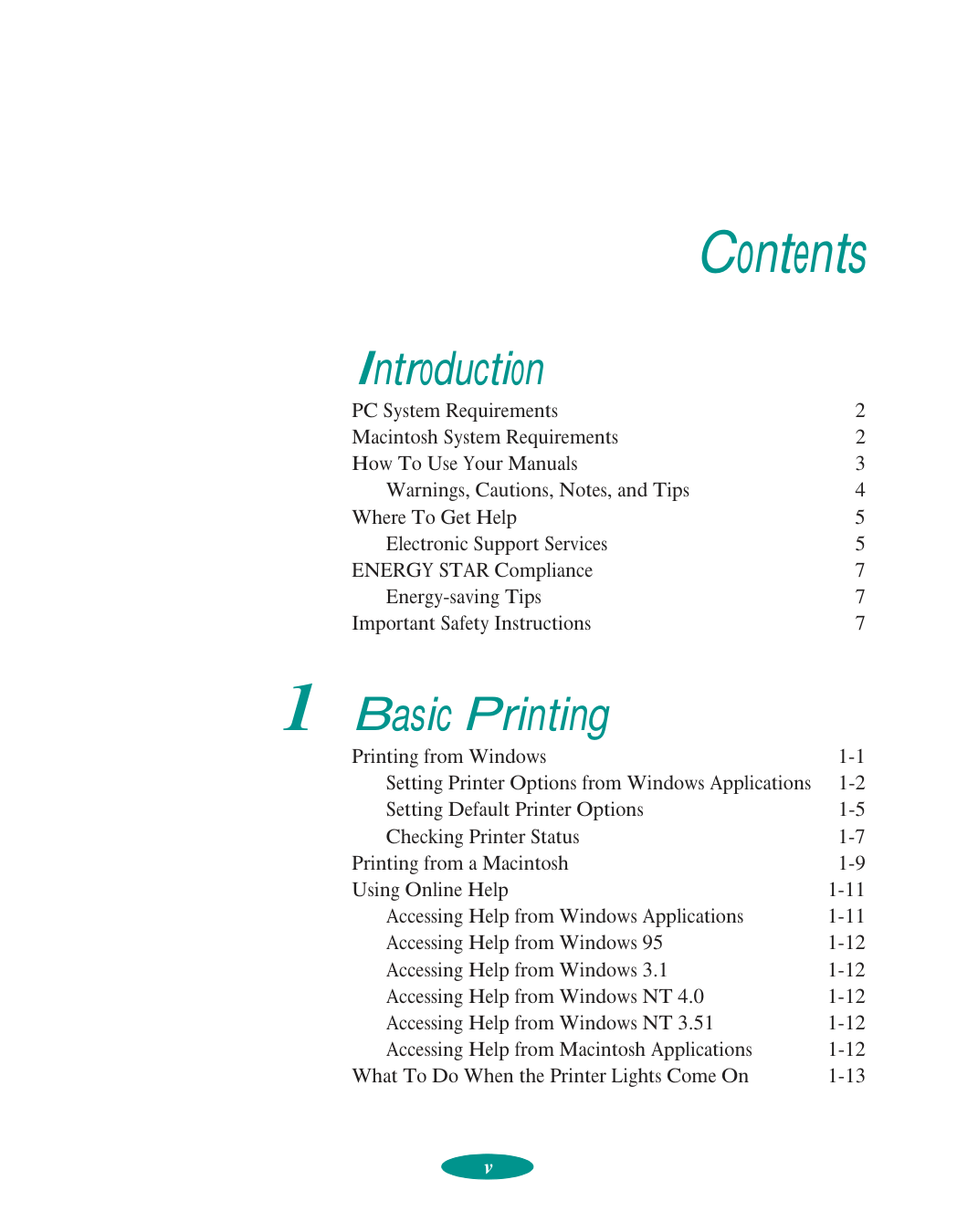 v Contents Introduction PC System Requirements 2 Macintosh System Requirements 2 How To Use Your Manuals 3 Warnings, Cautions, Notes, and Tips 4 Where To Get Help 5 Electronic Support Services 5 ENERGY STAR Compliance 7 Energy-saving Tips 7 Important Safety Instructions 7 1 Basic Printing Printing from Windows 1-1 Setting Printer Options from Windows Applications 1-2 Setting Default Printer Options 1-5 Checking Printer Status 1-7 Printing from a Macintosh 1-9 Using Online Help 1-11 Accessing Help from Windows Applications 1-11 Accessing Help from Windows 95 1-12 Accessing Help from Windows 3.1 1-12 Accessing Help from Windows NT 4.0 1-12 Accessing Help from Windows NT 3.51 1-12 Accessing Help from Macintosh Applications 1-12 What To Do When the Printer Lights Come On 1-13