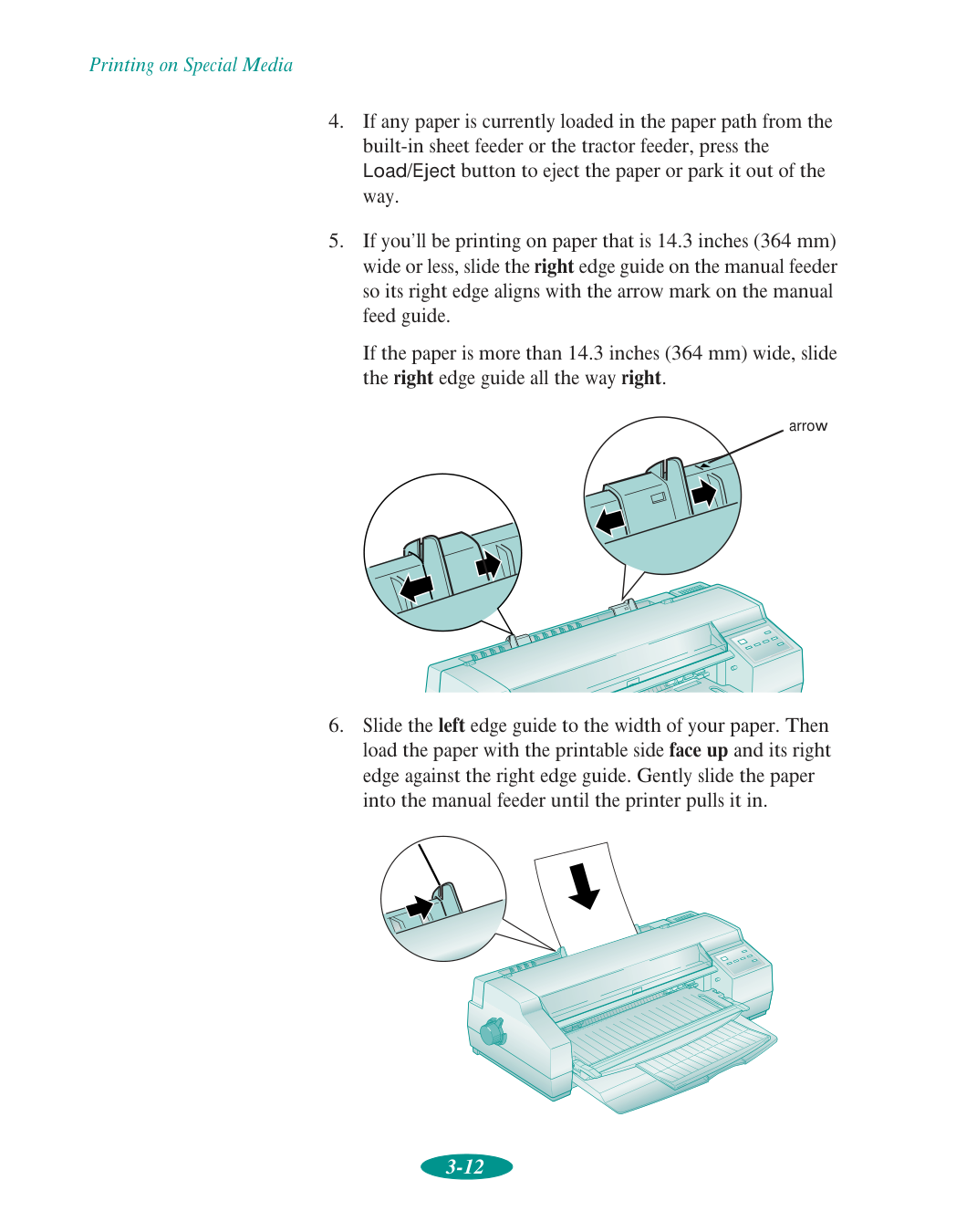 Note: Since the quality of any particular brand or type of paper may be changed by the manufacturer at any time, EPSON cannot attest to the quality of any non-EPSON brand or type of paper. Always test samples of paper stock before purchasing large quantities or printing large jobs. Poor quality paper may reduce print quality and cause paper jams and other problems. If you encounter problems, switch to a higher grade of paper. Ink jet paper, envelopes, glossy film, glossy paper, transparencies, and self adhesive sheets are usable only under these conditions: Temperature: 59 to 77 °F (15 to 25 °C) Humidity: 40 to 60% RH EPSON Photo Quality Glossy Film and Photo Quality Self Adhesive Sheets should be stored under these conditions: Temperature: 59 to 86 °F (15 to 30 °C) Humidity: 20 to 60% RH Printable areas Note: The maximum printable width is 13.6 inches (345 mm) regardless of the paper size or feeder you use. Single sheets and index cardsA: