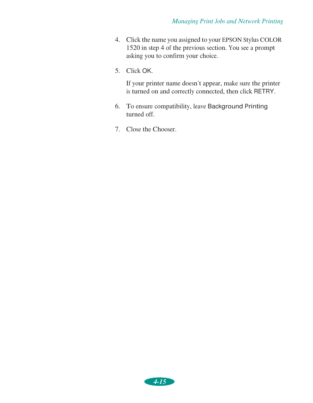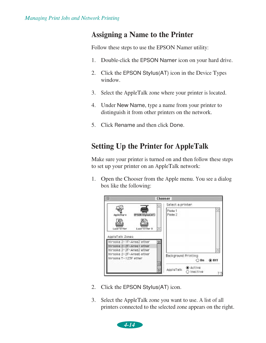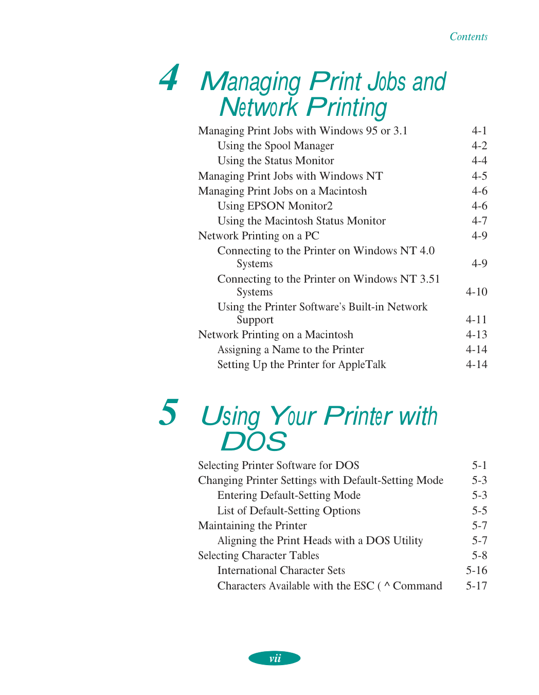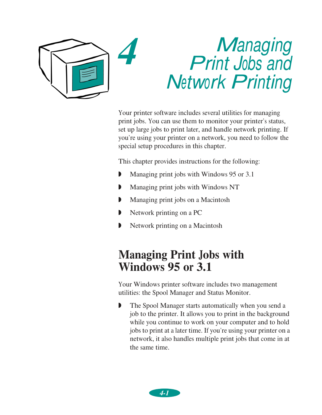 Contents vii 4 Managing Print Jobs and Network Printing Managing Print Jobs with Windows 95 or 3.1 4-1 Using the Spool Manager 4-2 Using the Status Monitor 4-4 Managing Print Jobs with Windows NT 4-5 Managing Print Jobs on a Macintosh 4-6 Using EPSON Monitor2 4-6 Using the Macintosh Status Monitor 4-7 Network Printing on a PC 4-9 Connecting to the Printer on Windows NT 4.0 Systems 4-9 Connecting to the Printer on Windows NT 3.51 Systems 4-10 Using the Printer Software’s Built-in Network Support 4-11 Network Printing on a Macintosh 4-13 Assigning a Name to the Printer 4-14 Setting Up the Printer for AppleTalk 4-14 5 Using Your Printer with