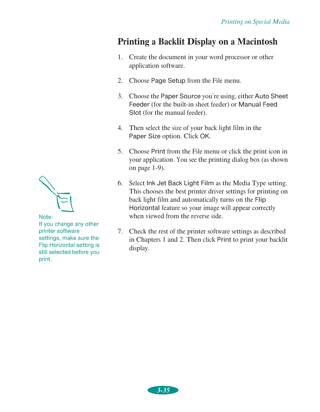Back light film choosing, 3-3 to 3-4 printing on, 3-33 to 3-35 specifications, C-3 Background printing Macintosh, 1-11, 4-6 to 4-7, 7-12Pc, 4-1
