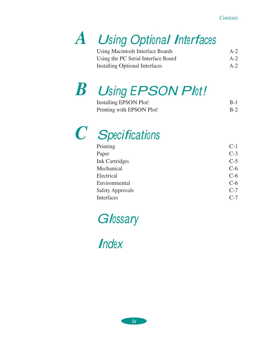 Complete specifications including printing capabilities, mechanical specifications, electrical requirements, and interface information are listed in Section C starting at page C-1. Paper specifications and supported media types are detailed on pages C-3 to C-5.