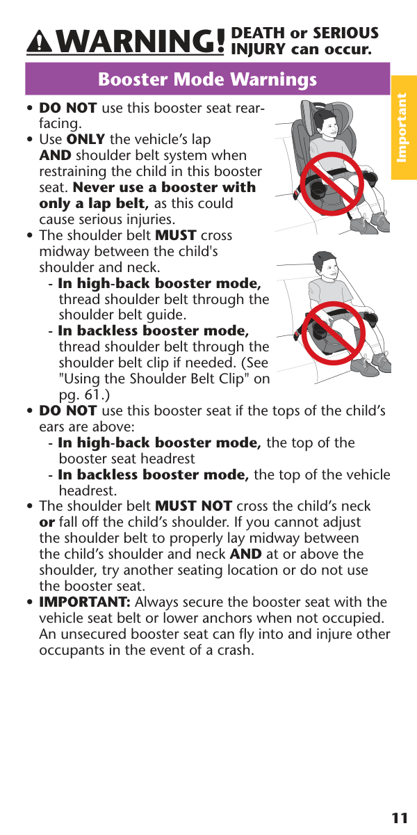 DEATH or SERIOUS INJURY can occur. Booster Mode Warnings Important12