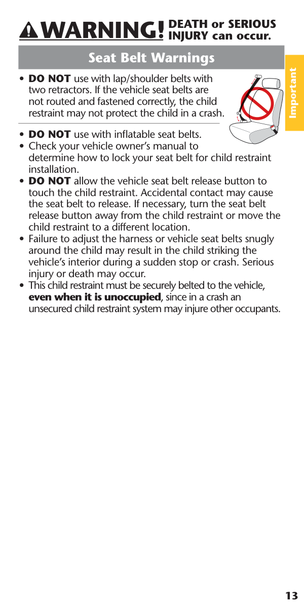 DEATH or SERIOUS INJURY can occur. Seat Belt Warnings13
