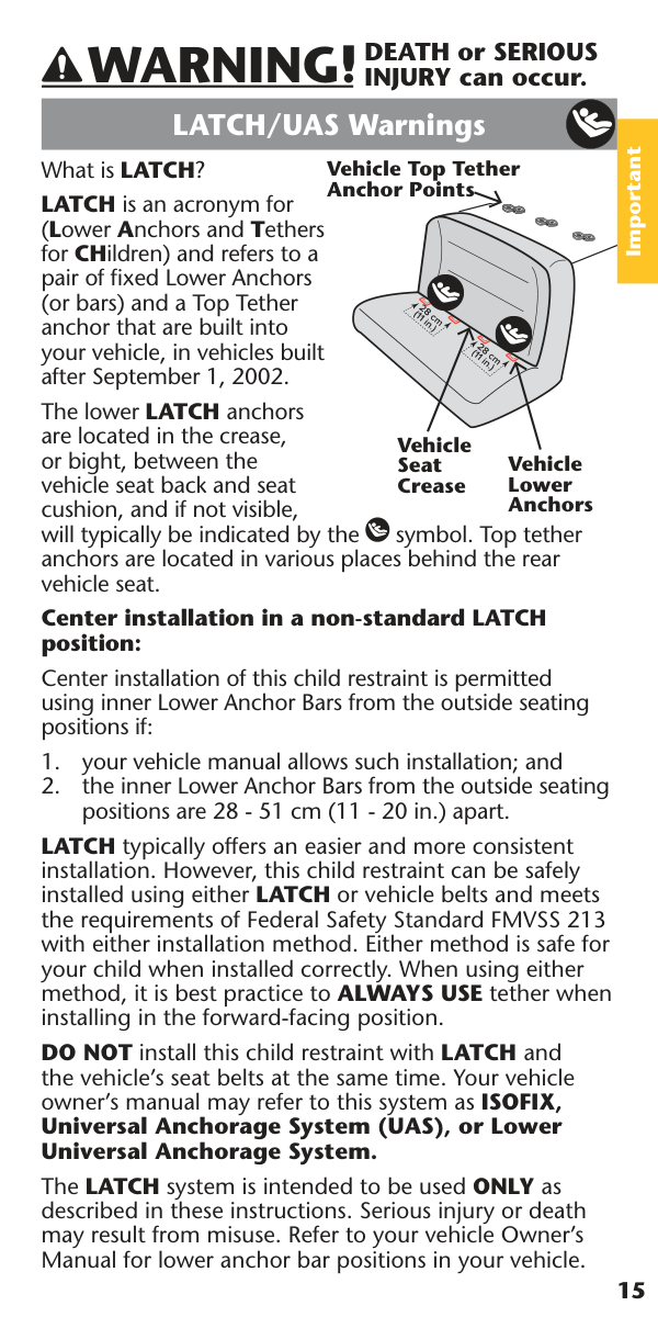 DEATH or SERIOUS INJURY can occur. Seat Belt Warnings15 LATCH/UAS Warnings What is LATCH? LATCH is an acronym for (Lower Anchors and Tethers for CHildren) and refers to a pair of fixed Lower Anchors (or bars) and a Top Tether anchor that are built into your vehicle, in vehicles built after September 1, 2002. The lower LATCH anchors are located in the crease, or bight, between the vehicle seat back and seat cushion, and if not visible, will typically be indicated by the symbol. Top tether anchors are located in various places behind the rear vehicle seat. Center installation in a non-standard LATCH position: Center installation of this child restraint is permitted using inner Lower Anchor Bars from the outside seating positions if: