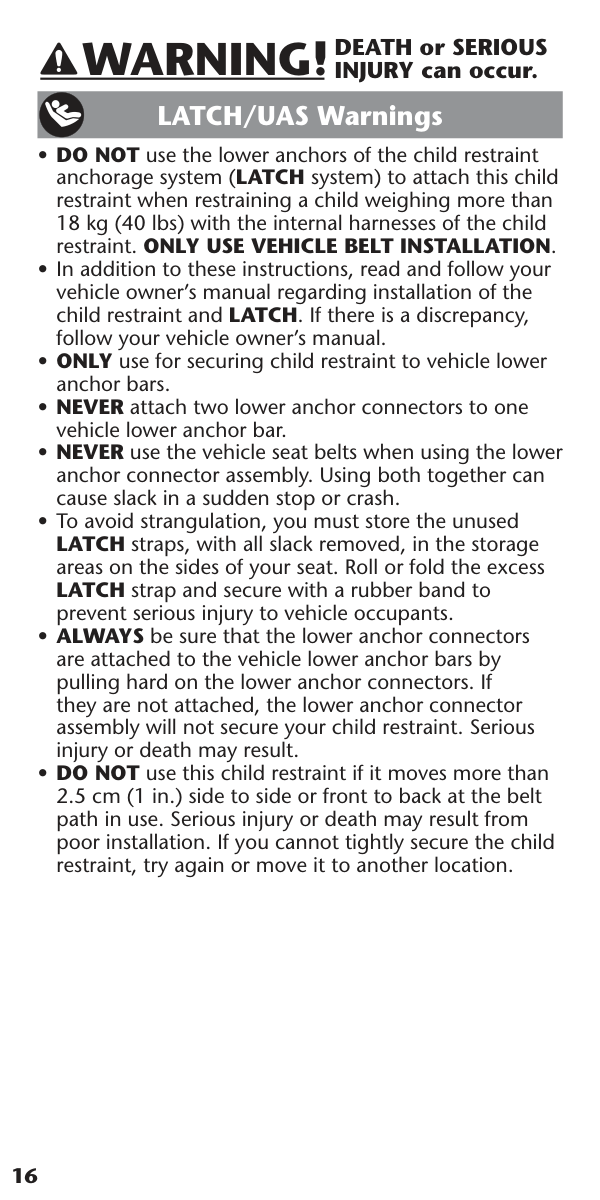 DEATH or SERIOUS INJURY can occur. LATCH/UAS Warnings17 Tether Strap Warnings