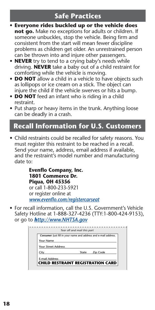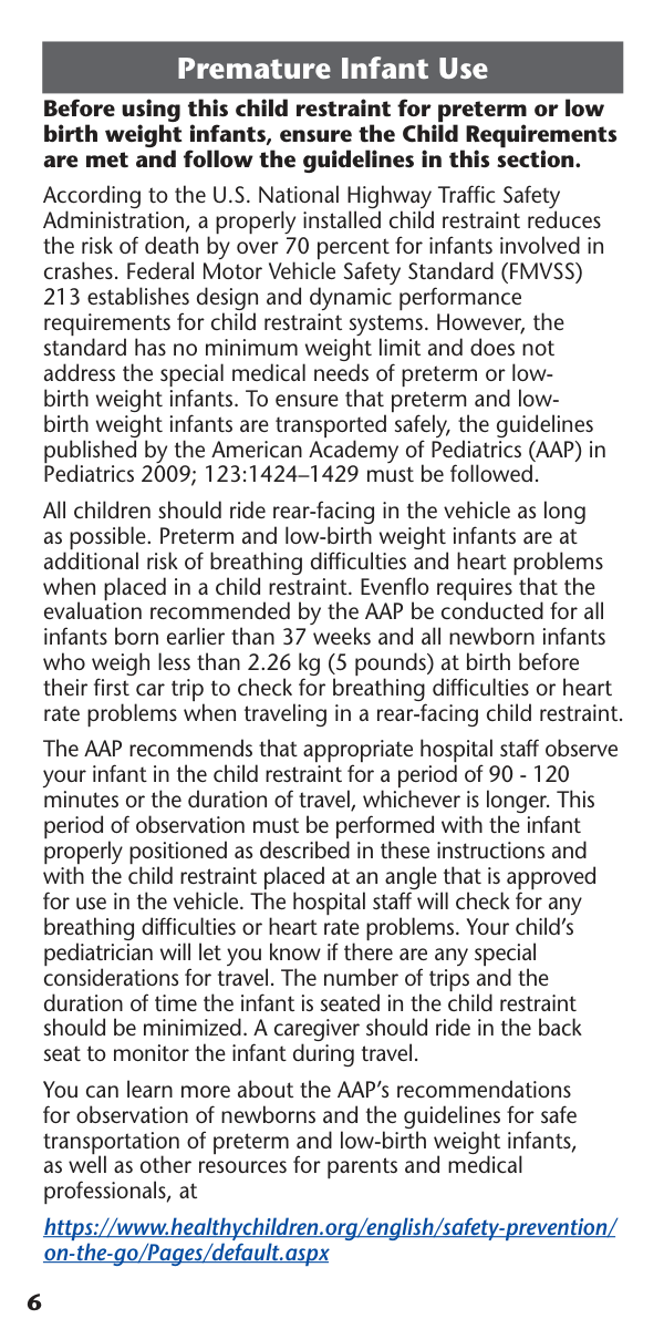 6 Before using this child restraint for preterm or low birth weight infants, ensure the Child Requirements are met and follow the guidelines in this section. According to the U.S. National Highway Traffic Safety Administration, a properly installed child restraint reduces the risk of death by over 70 percent for infants involved in crashes. Federal Motor Vehicle Safety Standard (FMVSS) 213 establishes design and dynamic performance requirements for child restraint systems. However, the standard has no minimum weight limit and does not address the special medical needs of preterm or low- birth weight infants. To ensure that preterm and low- birth weight infants are transported safely, the guidelines published by the American Academy of Pediatrics (AAP) in Pediatrics 2009; 123:1424–1429 must be followed. All children should ride rear-facing in the vehicle as long as possible. Preterm and low-birth weight infants are at additional risk of breathing difficulties and heart problems when placed in a child restraint. Evenflo requires that the evaluation recommended by the AAP be conducted for all infants born earlier than 37 weeks and all newborn infants who weigh less than 2.26 kg (5 pounds) at birth before their first car trip to check for breathing difficulties or heart rate problems when traveling in a rear-facing child restraint. The AAP recommends that appropriate hospital staff observe your infant in the child restraint for a period of 90 - 120 minutes or the duration of travel, whichever is longer. This period of observation must be performed with the infant properly positioned as described in these instructions and with the child restraint placed at an angle that is approved for use in the vehicle. The hospital staff will check for any breathing difficulties or heart rate problems. Your child’s pediatrician will let you know if there are any special considerations for travel. The number of trips and the duration of time the infant is seated in the child restraint should be minimized. A caregiver should ride in the back seat to monitor the infant during travel. You can learn more about the AAP’s recommendations for observation of newborns and the guidelines for safe transportation of preterm and low-birth weight infants, as well as other resources for parents and medical professionals, at https://www.healthychildren.org/english/safety-prevention/ on-the-go/Pages/default.aspx Premature Infant Use