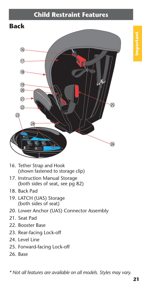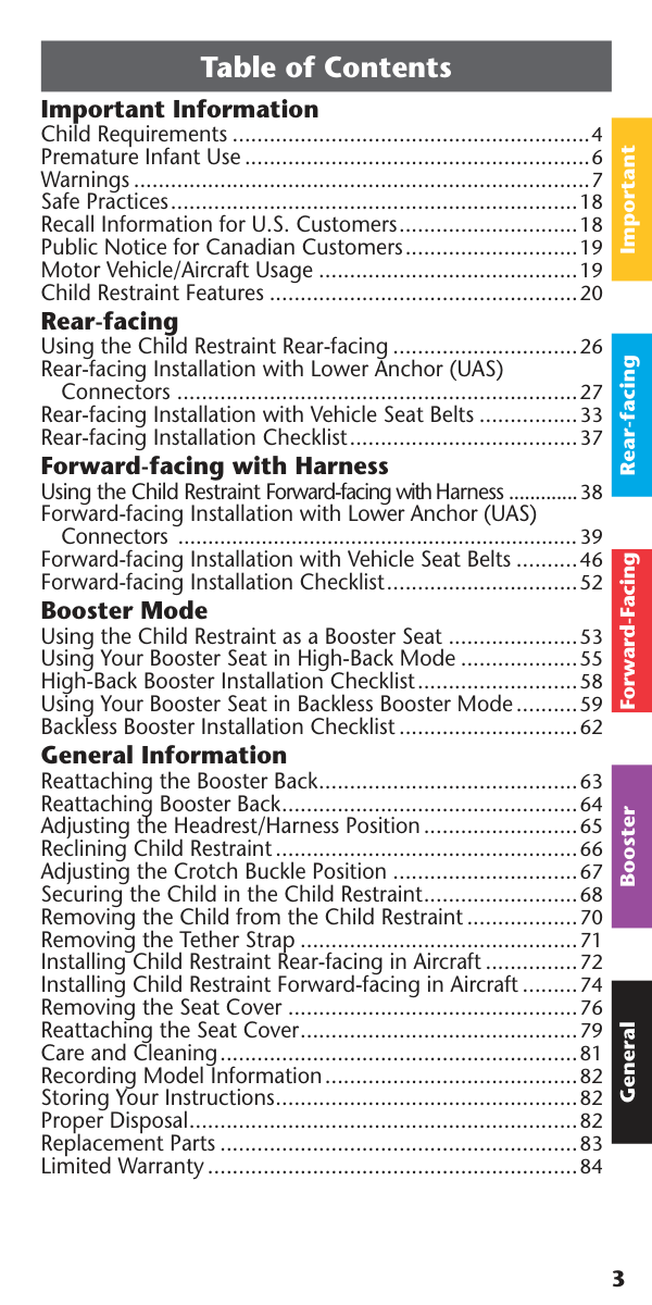 (Model numbers ending in “C.”) This child restraint meets all applicable requirements of Canadian Motor Vehicle Safety Standards CMVSS 213, 213.1, and 213.2. Airbag Symbol – Alerts you to important information about airbag safety. LATCH Symbol – Alerts you to important information about LATCH safety. Tether Anchor Symbol – Alerts you to important information about Tether Anchor safety. Aircraft Symbol – Alerts you to important information about aircraft safety. Symbol Legend 2Important Rear-facing Forward-Facing Booster General 3 Table of Contents Important Information Child Requirements����������������������������������������������������������4 Premature Infant Use��������������������������������������������������������6 Warnings��������������������������������������������������������������������������7 Safe Practices������������������������������������������������������������������18 Recall Information for U.S. Customers�����������������������������18 Public Notice for Canadian Customers����������������������������19 Motor Vehicle/Aircraft Usage������������������������������������������19 Child Restraint Features��������������������������������������������������20 Rear-facing Using the Child Restraint Rear-facing������������������������������26 Rear-facing Installation with Lower Anchor (UAS) Connectors �����������������������������������������������������������������27 Rear-facing Installation with Vehicle Seat Belts����������������33 Rear-facing Installation Checklist�������������������������������������37 Forward-facing with Harness Using the Child Restraint Forward-facing with Harness�������������38 Forward-facing Installation with Lower Anchor (UAS) Connectors �������������������������������������������������������������������39 Forward-facing Installation with Vehicle Seat Belts����������46 Forward-facing Installation Checklist�������������������������������52 Booster Mode Using the Child Restraint as a Booster Seat���������������������53 Using Your Booster Seat in High-Back Mode�������������������55 High-Back Booster Installation Checklist��������������������������58 Using Your Booster Seat in Backless Booster Mode����������59 Backless Booster Installation Checklist�����������������������������62 General Information Reattaching the Booster Back������������������������������������������63 Reattaching Booster Back������������������������������������������������64 Adjusting the Headrest/Harness Position�������������������������65 Reclining Child Restraint�������������������������������������������������66 Adjusting the Crotch Buckle Position������������������������������67 Securing the Child in the Child Restraint�������������������������68 Removing the Child from the Child Restraint������������������70 Removing the Tether Strap���������������������������������������������71 Installing Child Restraint Rear-facing in Aircraft���������������72 Installing Child Restraint Forward-facing in Aircraft���������74 Removing the Seat Cover�����������������������������������������������76 Reattaching the Seat Cover���������������������������������������������79 Care and Cleaning����������������������������������������������������������81 Recording Model Information�����������������������������������������82 Storing Your Instructions�������������������������������������������������82 Prop