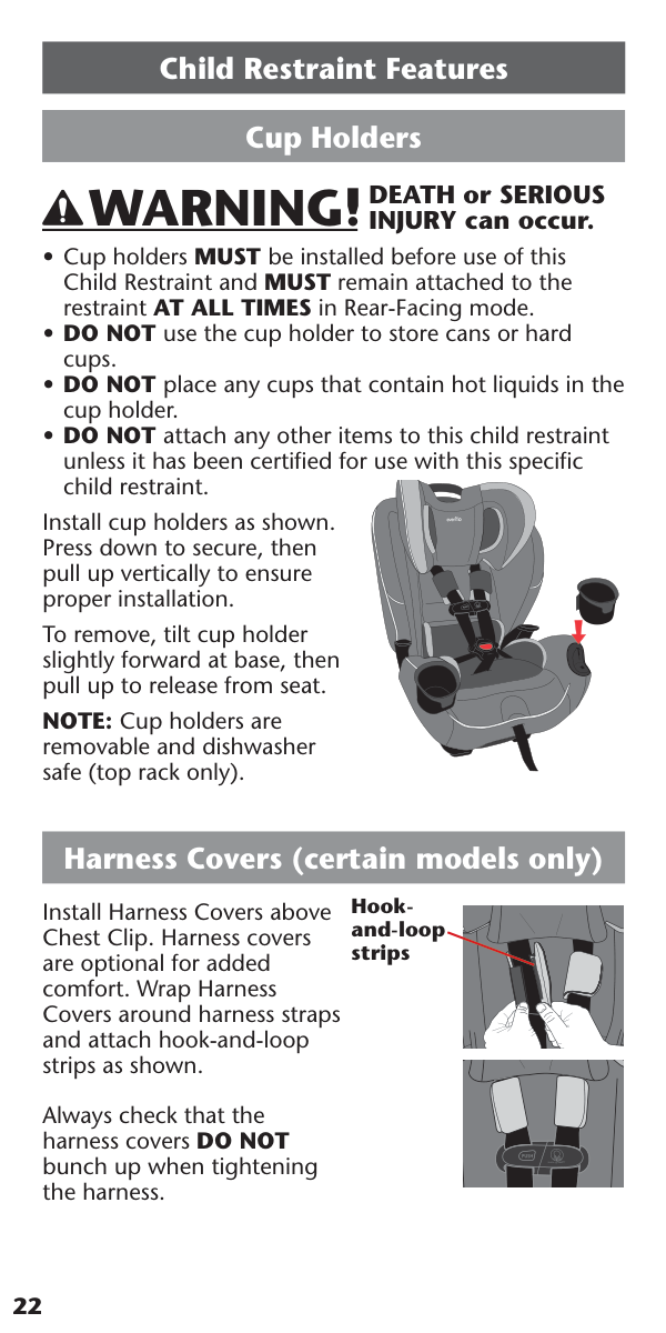 Hook- and-loop strips Cup Holders Harness Covers (certain models only)Warning!