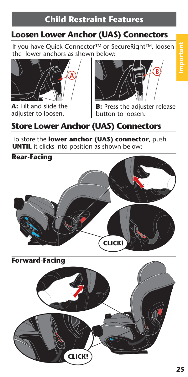 Rear-facing lower anchor (UAS) storage Child Restraint Features Lower Anchor Connector (UAS) Release Strap Quick Connector™ with LATCH/UAS Guide Release Strap EasyClick™ SecureRight™25 To store the lower anchor (UAS) connector, push UNTIL it clicks into position as shown below: Rear-Facing Forward-Facing 3 2 1