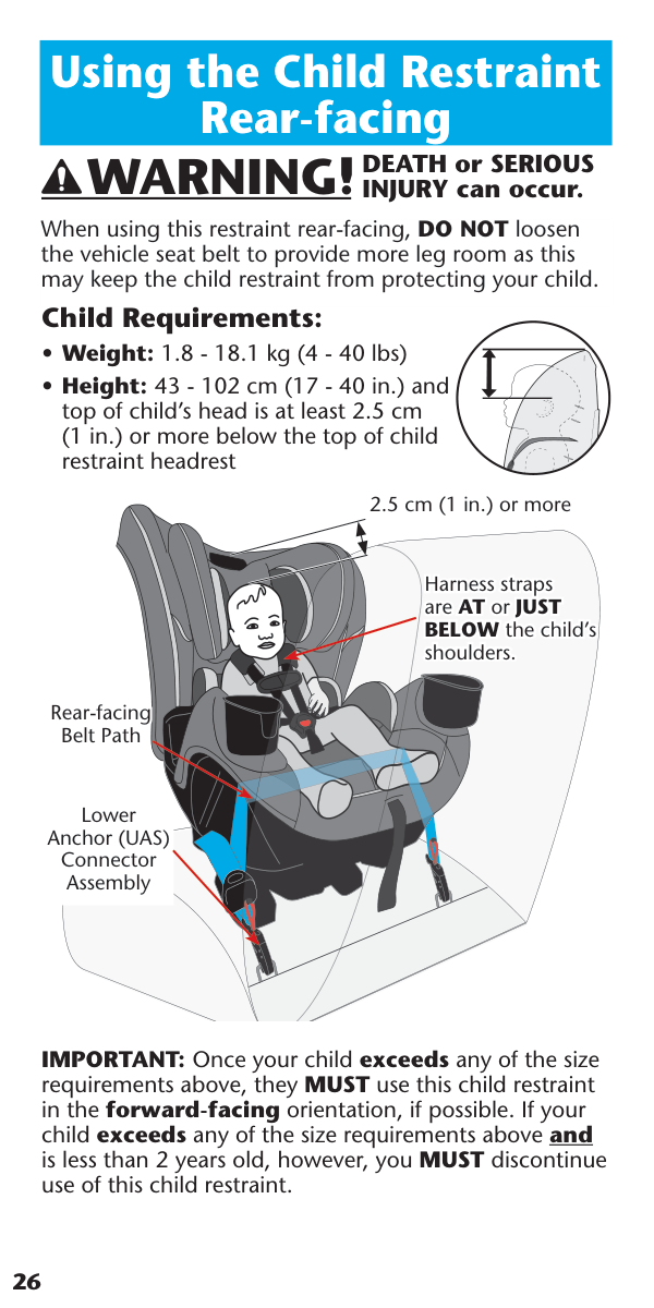 The rear-facing weight requirement is 1.8 - 18.1 kg (4 - 40 lbs) and the height requirement is 43 - 102 cm (17 - 40 in.). Additionally, the top of your child's head must be at least 2.5 cm (1 in.) or more below the top of the child restraint headrest. Once your child exceeds any of these size requirements, they must transition to forward-facing mode if possible, or discontinue use if under 2 years old. (Pages 4, 26)