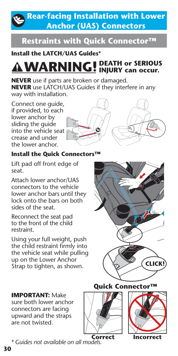 Restraints with EasyClick™ Rear-facing Installation with Lower Anchor (UAS) Connectors Reconnect the seat pad to the front of the child restraint. Tighten the strap by moving the handle back and forth on the lower anchor connector as shown until the seat is tight. Fold handle up after tightening. Correct Incorrect EasyClick™30 Install the LATCH/UAS Guides* NEVER use if parts are broken or damaged. NEVER use LATCH/UAS Guides if they interfere in any way with installation. Connect one guide, if provided, to each lower anchor by sliding the guide into the vehicle seat crease and under the lower anchor. Install the Quick Connectors™ Lift pad off front edge of seat. Attach lower anchor/UAS connectors to the vehicle lower anchor bars until they lock onto the bars on both sides of the seat. Reconnect the seat pad to the front of the child restraint. Using your full weight, push the child restraint firmly into the vehicle seat while pulling up on the Lower Anchor Strap to tighten, as shown. IMPORTANT: Make sure both lower anchor connectors are facing upward and the straps are not twisted.