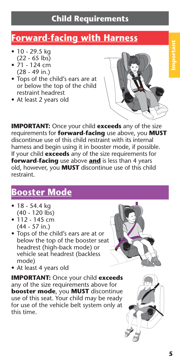 For forward-facing with harness use, children must weigh 10 - 29.5 kg (22 - 65 lbs), have a height of 71 - 124 cm (28 - 49 in.), have their ear tops at or below the top of the child restraint headrest, and be at least 2 years old. Once your child exceeds any of these size requirements and is at least 4 years old, you must discontinue use of the internal harness and begin using booster mode. (Page 38)