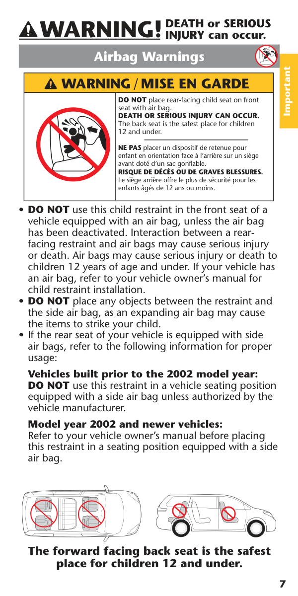 The back seat is the safest place for children 12 and under.Warning / Mise En Garde
