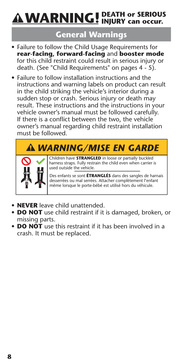 Des enfants se sont ÉTRANGLÉS dans des sangles de harnais desserrées ou mal serrées. Attacher complètement l’enfant même lorsque le porte-bébé est utilisé hors du véhicule. General WarningsWarning!