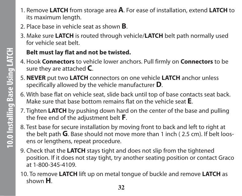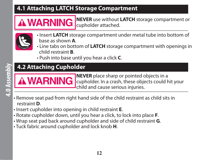 S’assurer que le bébé est à l’aise et que ses jambes passent complètement au travers des ouvertures de jambes E et que les bras du bébé reposent au-dessus des boucles d’entrée latérale C. Il doit être possible de mettre deux doigts entre la jambe du bébé et les ouvertures de jambes E. S’ASSURER QUE TOUTESLes Boucles Sont Bien Attachées.