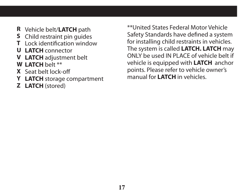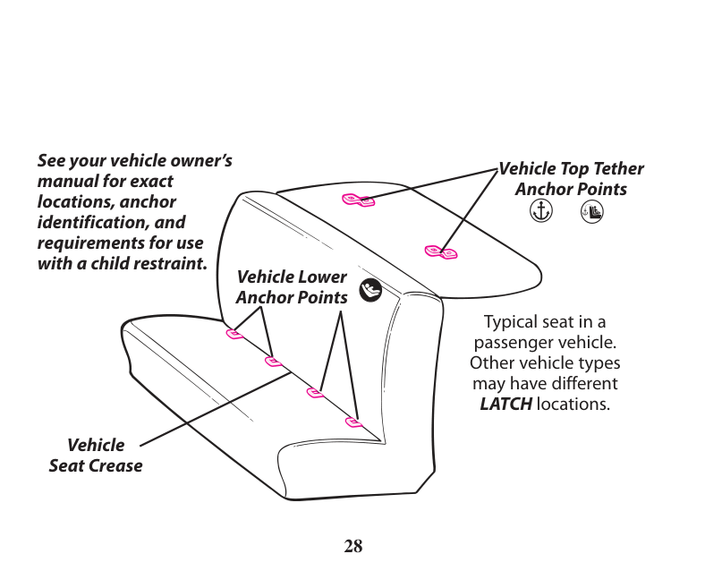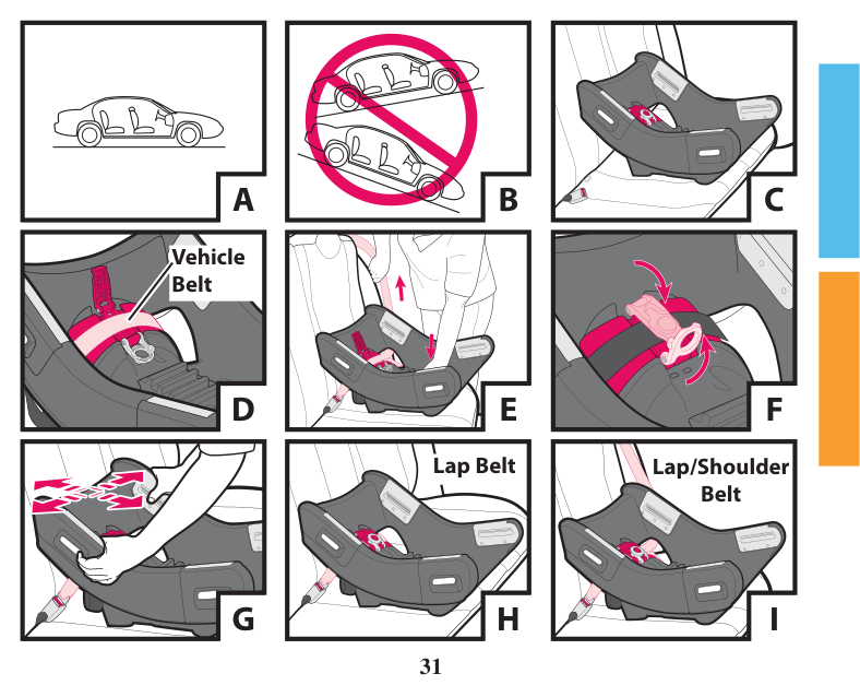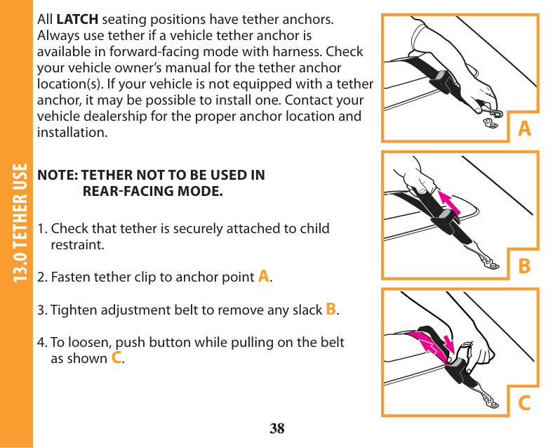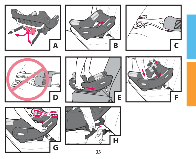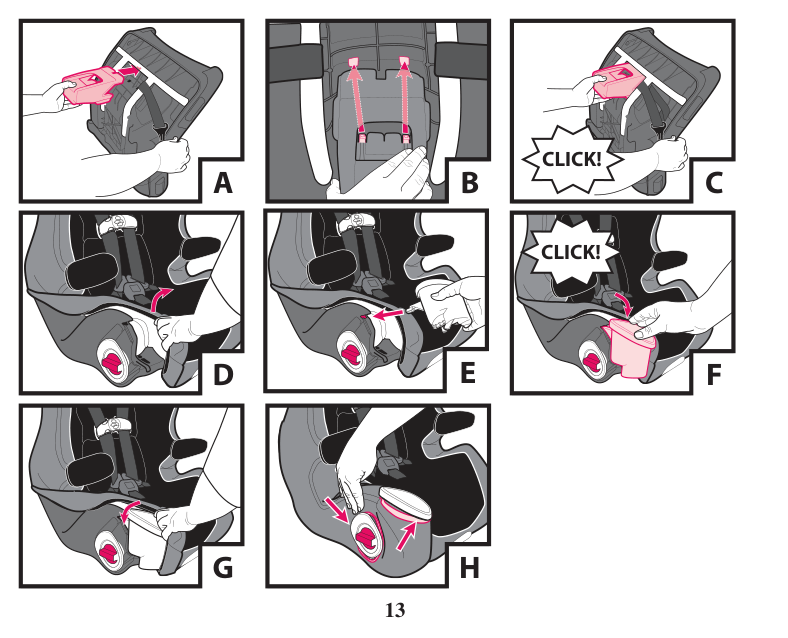With your right hand, press the handle release tab B and continue to hold down. With your left hand, lift the buckle handle A upward until it clicks. Twist the buckle handle A away from baby in an upward motion until you hear a click. Note: Twist until the handle tongue completely clears the groove C in the holder. Slide buckle handle A upward out of holder. Using the Side-entry Buckle To unfasten the side-entry buckleB