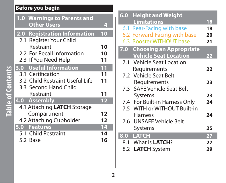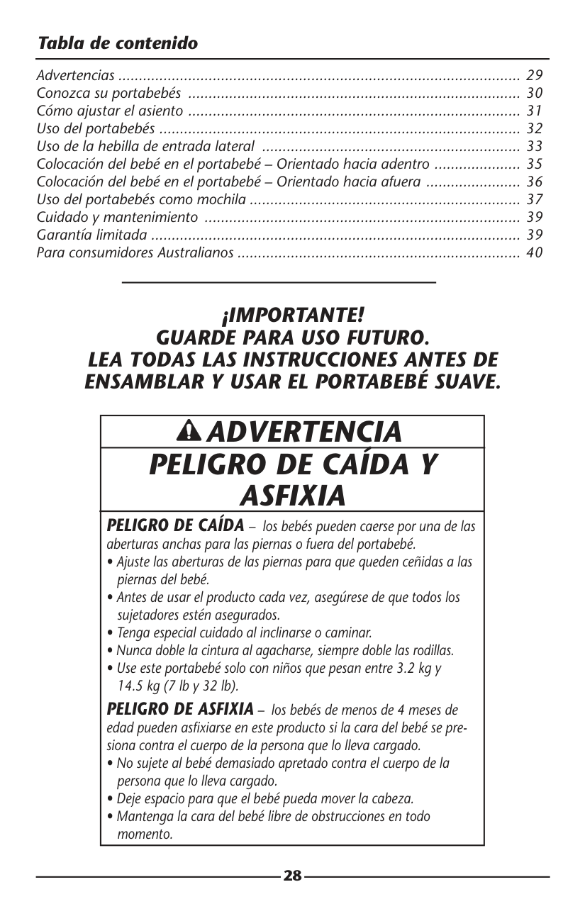 28 Tabla de contenido !DVERTENCIAS .................................................................................................. 29 #ONOZCASUPORTABEBÏS ................................................................................. Cómo ajustar el asiento ................................................................................. 31 5SODELPORTABEBÏS ........................................................................................ 32 5SODELAHEBILLADEENTRADALATERAL ............................................................... 33 #OLOCACIØNDELBEBÏENELPORTABEBÏn/RIENTADOHACIAADENTRO ..................... 35 #OLOCACIØNDELBEBÏENELPORTABEBÏn/RIENTADOHACIAAFUERA ....................... 36 5SODELPORTABEBÏSCOMOMOCHILA.................................................................. 37 Cuidado y mantenimiento ............................................................................. 39 Garantía limitada .......................................................................................... 39 Para consumidores Australianos .....................................................................