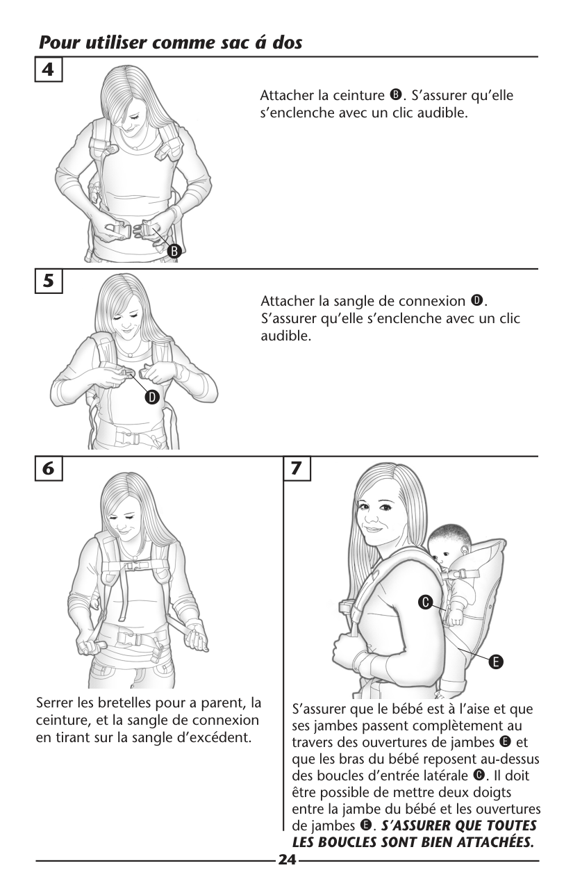 Tout en soutenant la tête et le dos du bébé, attacher le boucle d’entrée laté- rale C (se référer à la page 19). S’assurer qu’elle s’enclenche avec un clic audible.24 Pour utiliser comme sac á dos Attacher la ceinture B. S’assurer qu’elle s’enclenche avec un clic audible. Attacher la sangle de connexion D. S’assurer qu’elle s’enclenche avec un clic audible. Serrer les bretelles pour a parent, la ceinture, et la sangle de connexion en tirant sur la sangle d’excédent. 4 7 5