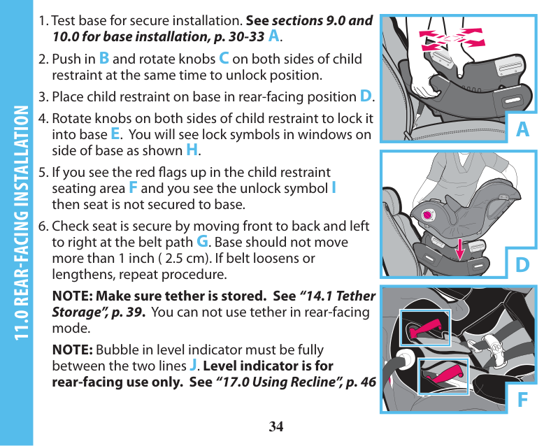 4 Make sure baby is comfortable with legs fully through leg openings E and baby’s arms resting above the side- entry buckle A. You should be able to fit two fingers between the baby’s leg and the leg openings E.Make Sure All Buckles Are