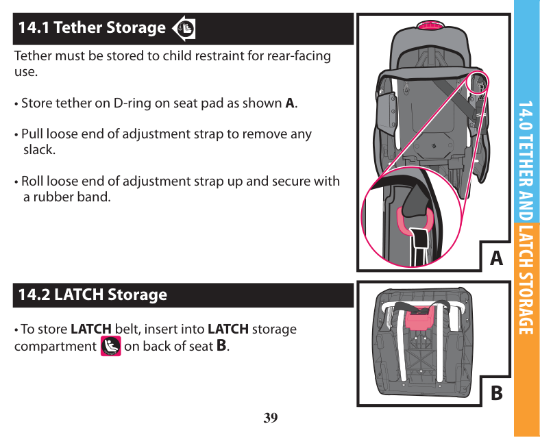 The carrier can be adjusted to two seat positions. The highest snap (A) is used for infants. To change the seat position, unsnap each seat positioning snap (B) and slide to the desired level. Fasten snaps securely BEFORE placing baby in carrier. Always select the position that provides the smallest leg opening suitable for the baby.