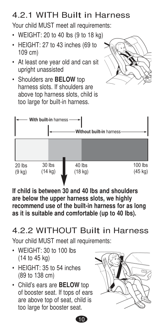 The forward-facing weight requirement is 10 - 29.5 kg (22 - 65 lbs), the height requirement is 71 - 124 cm (28 - 49 in.) with the tops of the child's ears at or below the top of the child restraint headrest, and the child must be at least 2 years old. Once your child exceeds any of these size requirements and is at least 4 years old, you must discontinue use of the internal harness and begin using the seat in booster mode. (Pages 5, 38)