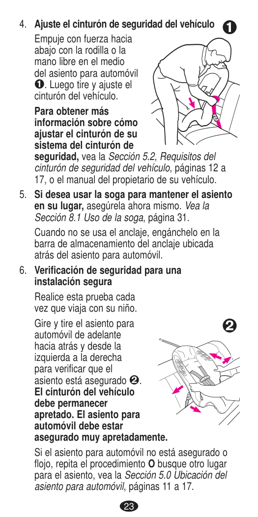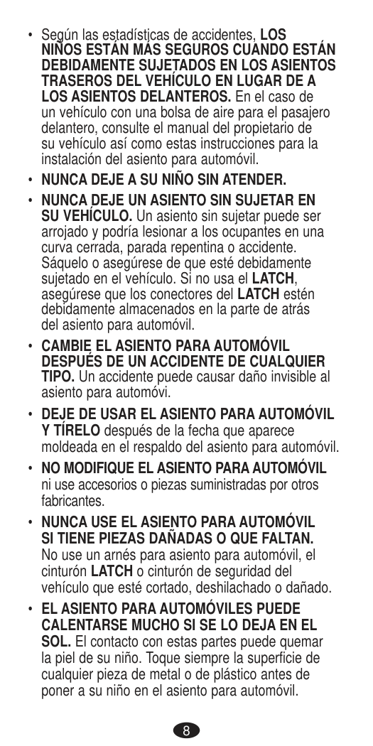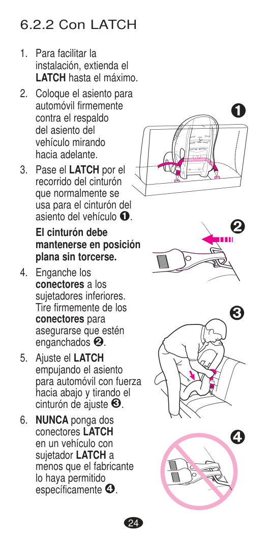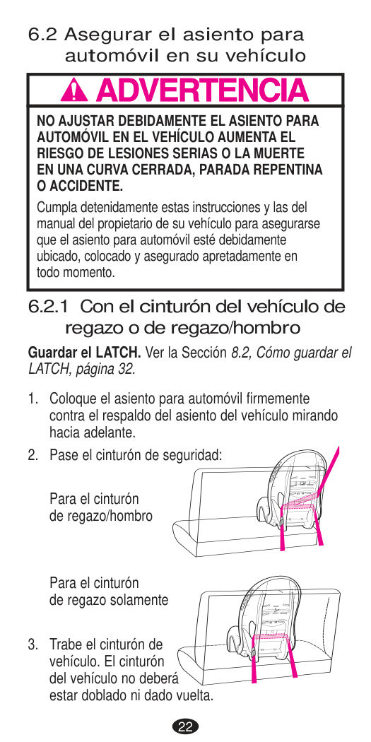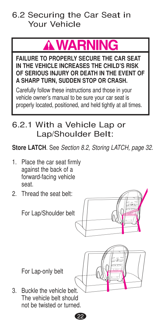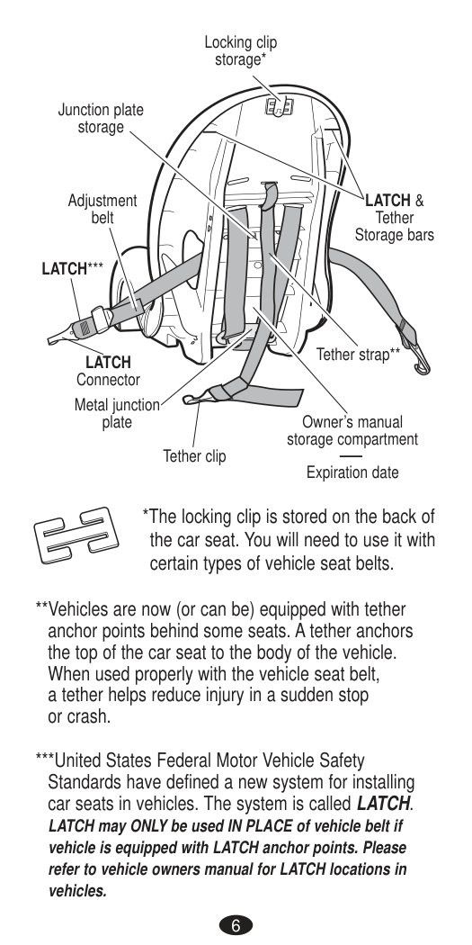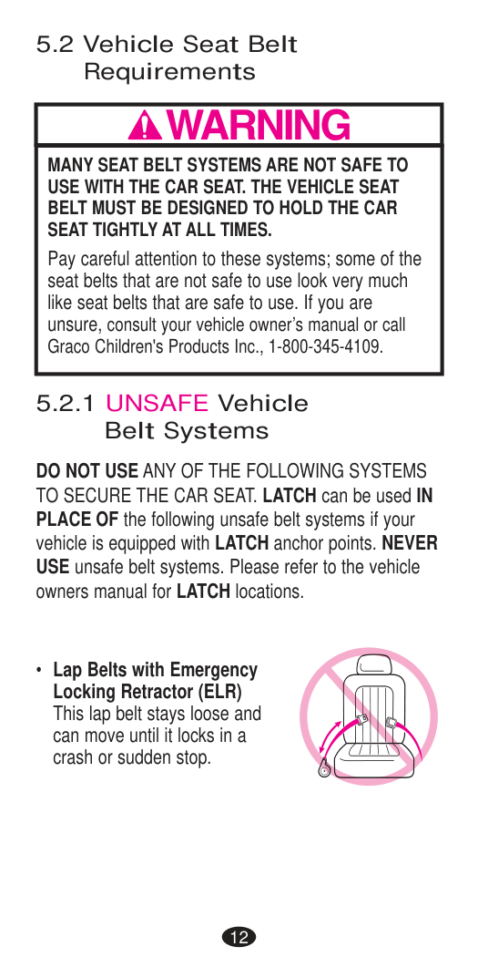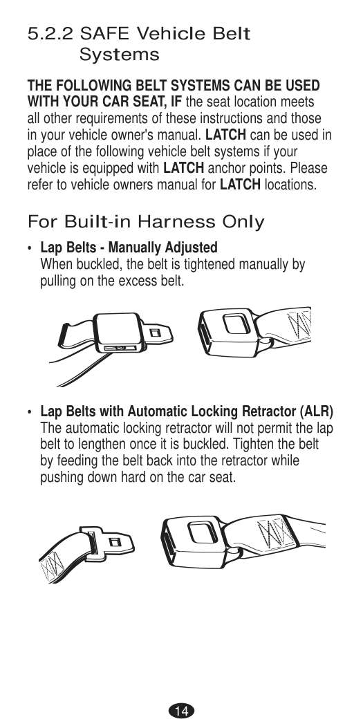 DEATH or SERIOUS INJURY can occur. Seat Belt Warnings Important14 If you have any of these types of vehicle belt systems listed, these are SAFE to use to install your child restraint in the vehicle. Review vehicle owner’s manual for specific instructions on child restraint installation. LATCH can be used IN PLACE OF these vehicle belt types. Refer to the Rear-facing and Forward-facing weight limits on LATCH use on pages 28 and 40. Refer to your vehicle owner’s manual for LATCH locations. Lap Belt with Locking Latch Plate Once buckled, the vehicle belt is tightened by pulling on the free end of the strap until the belt is tight. Lap Belt with Automatic Locking Retractor