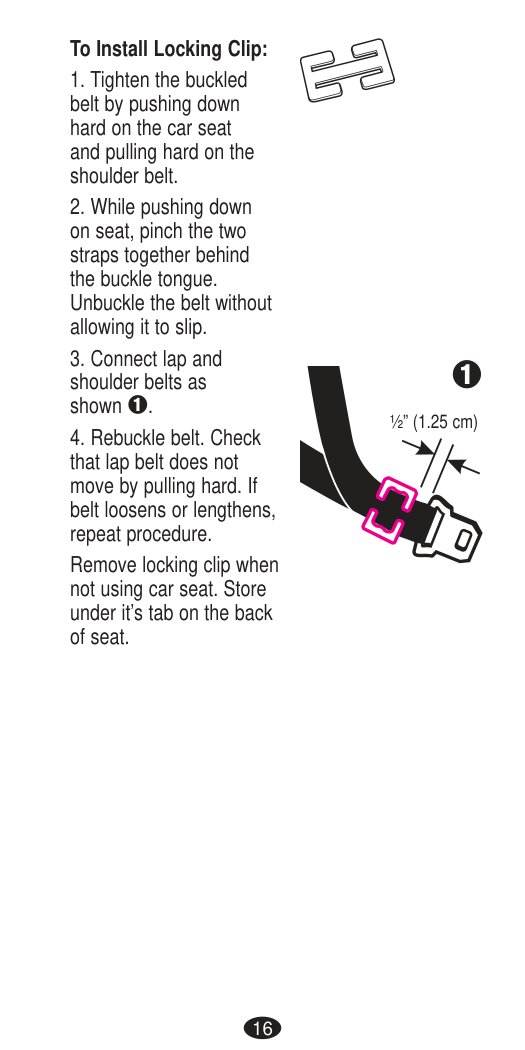 Chest clip Lap Shoulder Belt Lap Belt Route shoulder belt only through lock off. See user manual for additional information.Lock Off