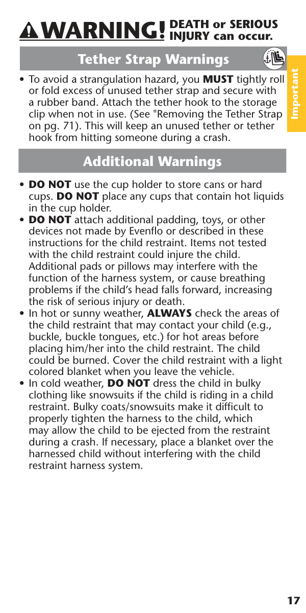 DEATH or SERIOUS INJURY can occur. LATCH/UAS Warnings17 Tether Strap Warnings