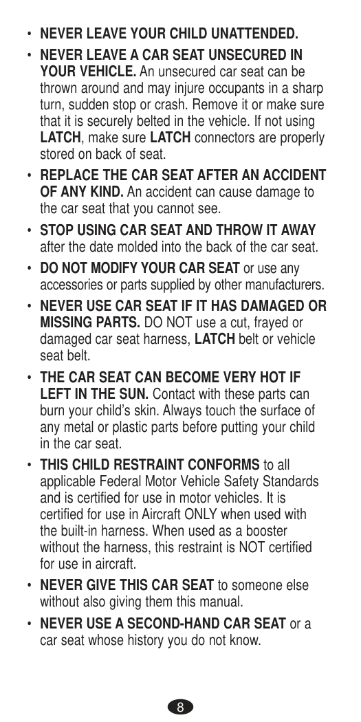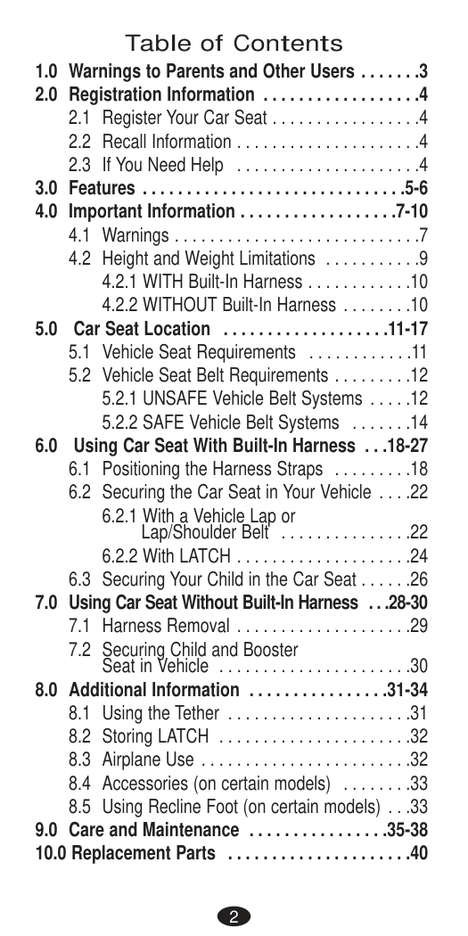 (Model numbers ending in “C.”) This child restraint meets all applicable requirements of Canadian Motor Vehicle Safety Standards CMVSS 213, 213.1, and 213.2. Airbag Symbol – Alerts you to important information about airbag safety. LATCH Symbol – Alerts you to important information about LATCH safety. Tether Anchor Symbol – Alerts you to important information about Tether Anchor safety. Aircraft Symbol – Alerts you to important information about aircraft safety. Symbol Legend 2Important Rear-facing Forward-Facing Booster General 3 Table of Contents Important Information Child Requirements����������������������������������������������������������4 Premature Infant Use��������������������������������������������������������6 Warnings��������������������������������������������������������������������������7 Safe Practices������������������������������������������������������������������18 Recall Information for U.S. Customers�����������������������������18 Public Notice for Canadian Customers����������������������������19 Motor Vehicle/Aircraft Usage������������������������������������������19 Child Restraint Features��������������������������������������������������20 Rear-facing Using the Child Restraint Rear-facing������������������������������26 Rear-facing Installation with Lower Anchor (UAS) Connectors �����������������������������������������������������������������27 Rear-facing Installation with Vehicle Seat Belts����������������33 Rear-facing Installation Checklist�������������������������������������37 Forward-facing with Harness Using the Child Restraint Forward-facing with Harness�������������38 Forward-facing Installation with Lower Anchor (UAS) Connectors �������������������������������������������������������������������39 Forward-facing Installation with Vehicle Seat Belts����������46 Forward-facing Installation Checklist�������������������������������52 Booster Mode Using the Child Restraint as a Booster Seat���������������������53 Using Your Booster Seat in High-Back Mode�������������������55 High-Back Booster Installation Checklist��������������������������58 Using Your Booster Seat in Backless Booster Mode����������59 Backless Booster Installation Checklist�����������������������������62 General Information Reattaching the Booster Back������������������������������������������63 Reattaching Booster Back������������������������������������������������64 Adjusting the Headrest/Harness Position�������������������������65 Reclining Child Restraint�������������������������������������������������66 Adjusting the Crotch Buckle Position������������������������������67 Securing the Child in the Child Restraint�������������������������68 Removing the Child from the Child Restraint������������������70 Removing the Tether Strap���������������������������������������������71 Installing Child Restraint Rear-facing in Aircraft���������������72 Installing Child Restraint Forward-facing in Aircraft���������74 Removing the Seat Cover�����������������������������������������������76 Reattaching the Seat Cover���������������������������������������������79 Care and Cleaning����������������������������������������������������������81 Recording Model Information�����������������������������������������82 Storing Your Instructions�������������������������������������������������82 Prop