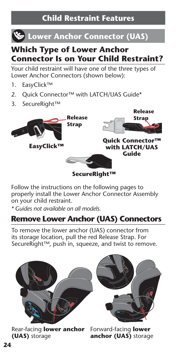 Rear-facing lower anchor (UAS) storage Child Restraint Features Lower Anchor Connector (UAS) Release Strap Quick Connector™ with LATCH/UAS Guide Release Strap EasyClick™ SecureRight™25 To store the lower anchor (UAS) connector, push UNTIL it clicks into position as shown below: Rear-Facing Forward-Facing 3 2 1