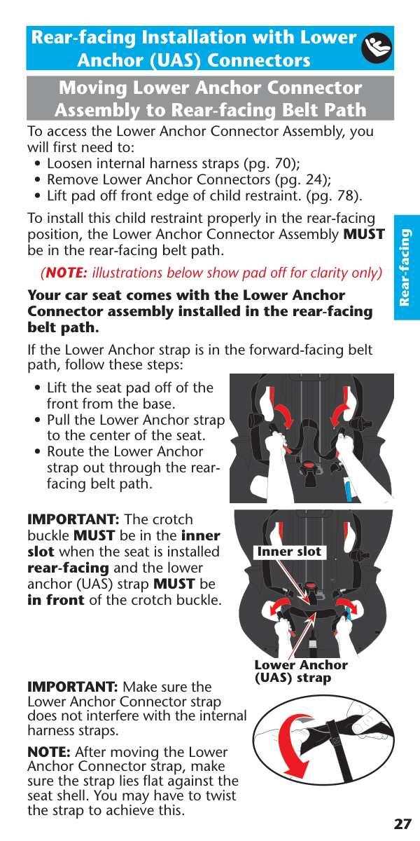 Rear-facing 29 Lift pad off front edge of seat as shown. Attach lower anchor / UAS connectors to the vehicle lower anchor bars until they lock onto the bars on both sides of the seat. IMPORTANT: Make sure both lower anchor connectors are facing upward and the straps are not twisted.