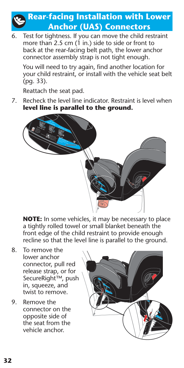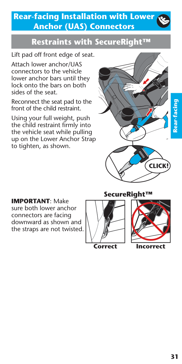 Restraints with SecureRight™ Correct Incorrect SecureRight™ Rear-facing Installation with Lower Anchor (UAS) Connectors Lift pad off front edge of seat. Attach lower anchor/UAS connectors to the vehicle lower anchor bars until they lock onto the bars on both sides of the seat. Reconnect the seat pad to the front of the child restraint. Using your full weight, push the child restraint firmly into the vehicle seat while pulling up on the Lower Anchor Strap to tighten, as shown. IMPORTANT: Make sure both lower anchor connectors are facing downward as shown and the straps are not twisted.32