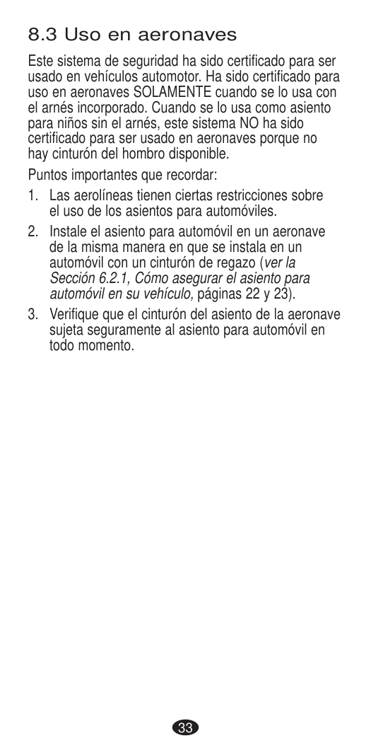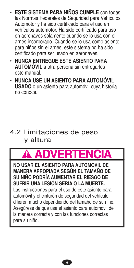 DEATH or SERIOUS INJURY can occur.72 The Federal Aviation Administration (FAA) recommends that you secure your child for air travel in an appropriate child restraint based on your child’s weight and size. Turbulence can happen with little or no warning. When turbulence occurs, the safest place for your child is in a properly installed child restraint, not in an adult’s lap or on the aircraft seat with its seat belt. Keeping your child in a child restraint during the flight will help ensure your family arrives safely at your destination. The FAA recommends that a child weighing: • more than 18 kg (40 lbs) use an aircraft seat belt; • less than 9 kg (20 lbs) use a rear-facing child restraint; and • from 9 - 18 kg (20 - 40 lbs) use a forward-facing child restraint. This restraint CANNOT be used in booster mode in aircraft. Please note that these FAA recommendations may vary from those applicable to the use of your child restraint in a motor vehicle. IMPORTANT: Before installing the child restraint, make sure the aircraft seat is in a fully upright position.